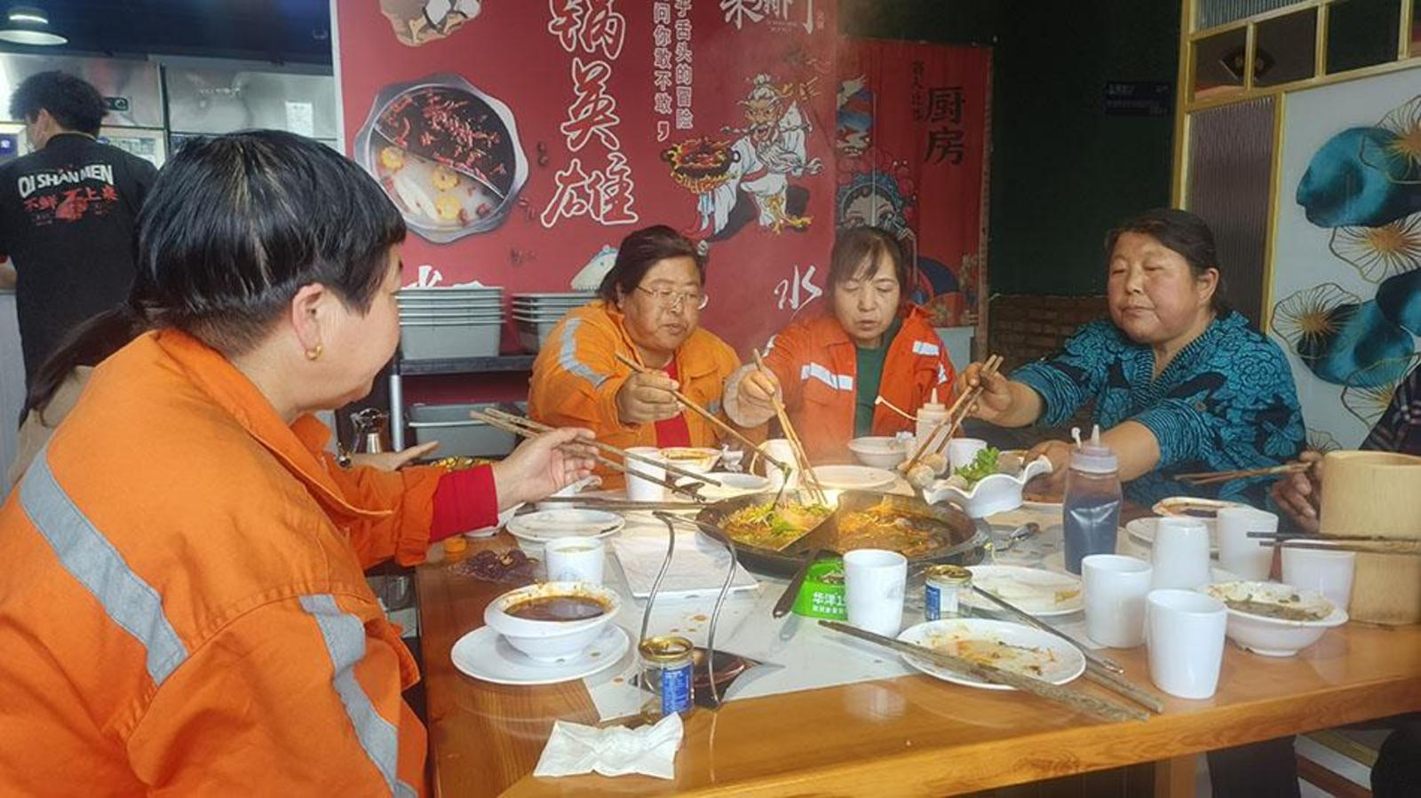 “今天的火锅吃得非常高兴,菜上得好,肉上得也多,吃得香得很。”环卫工人赵丽丽说。