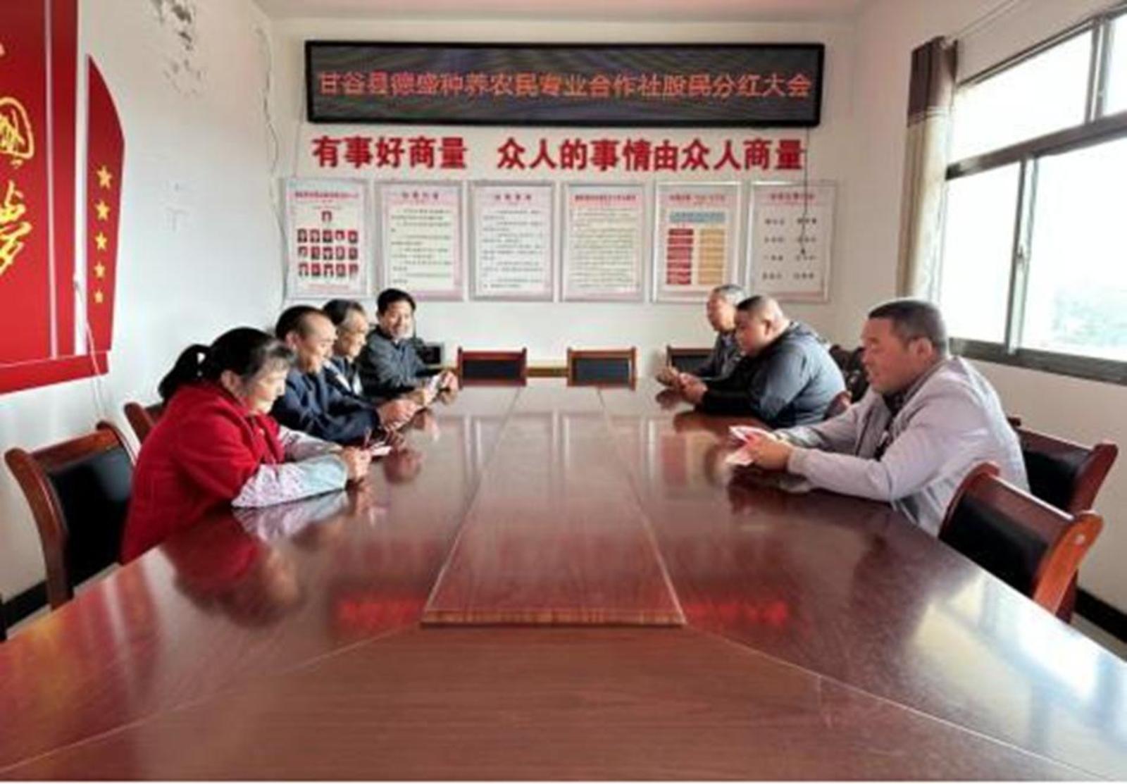 新天水讯 10月12日,甘谷县八里湾镇唐家湾村党支部领办合作社—德盛种养农民专业合作社分红仪式在八里湾镇唐家湾村委会议室举行。八里湾镇党支部领办合作社成员、村党支部书记、合作社全体社员、董事监事、村民代表们齐聚一堂,共同见证着合作社这一喜庆的“丰收”时刻。