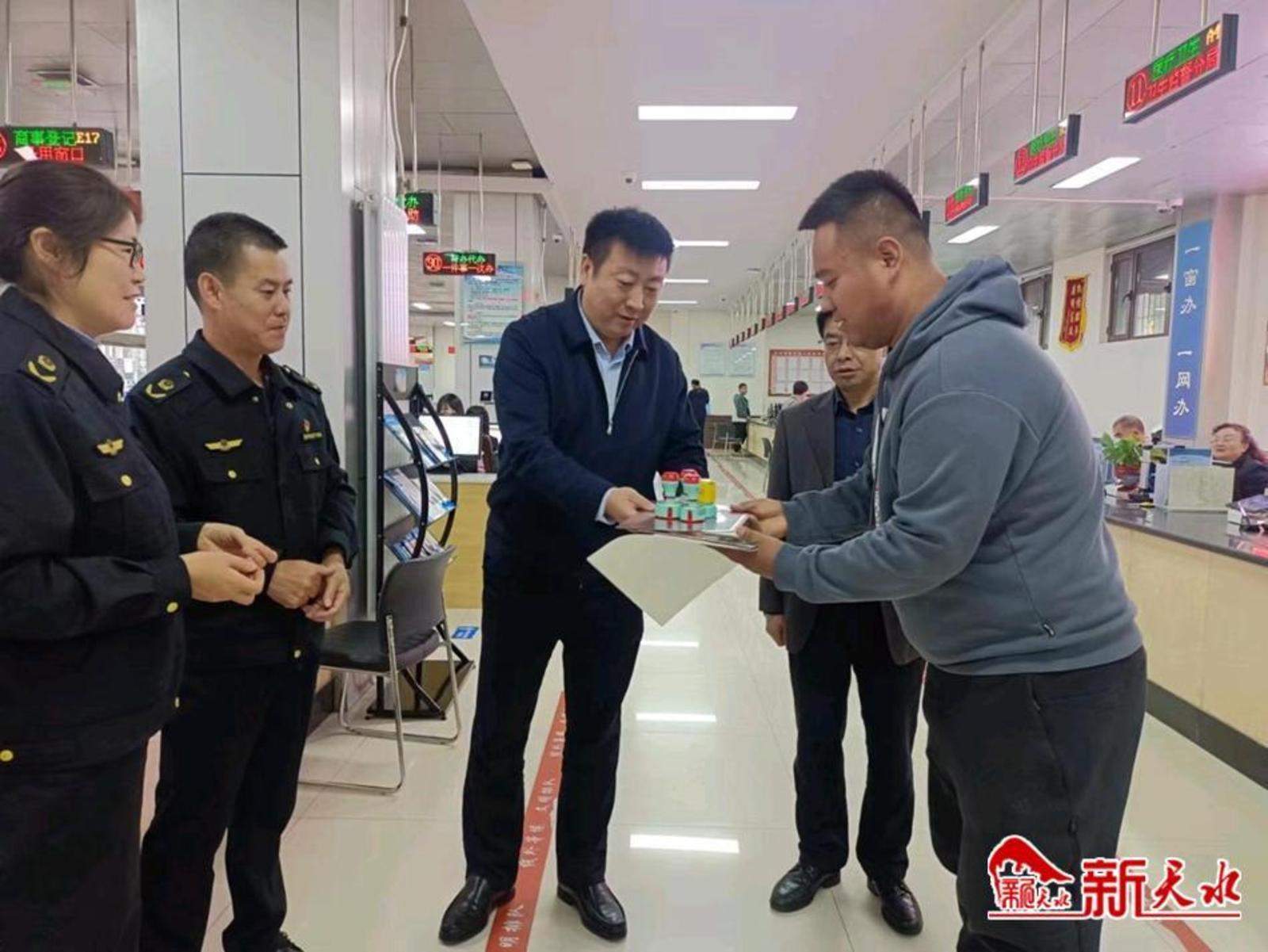 新天水讯 10月17日,麦积区市场监管局党组书记、局长张海斌向天水七陇珠文化传媒有限公司这家新开办企业发放了一套包括公章、财务专用章、合同专用章、法人章在内的4枚印章,该企业也成为麦积区推行新开办企业首套印章政府买单政策后的首家受惠企业。