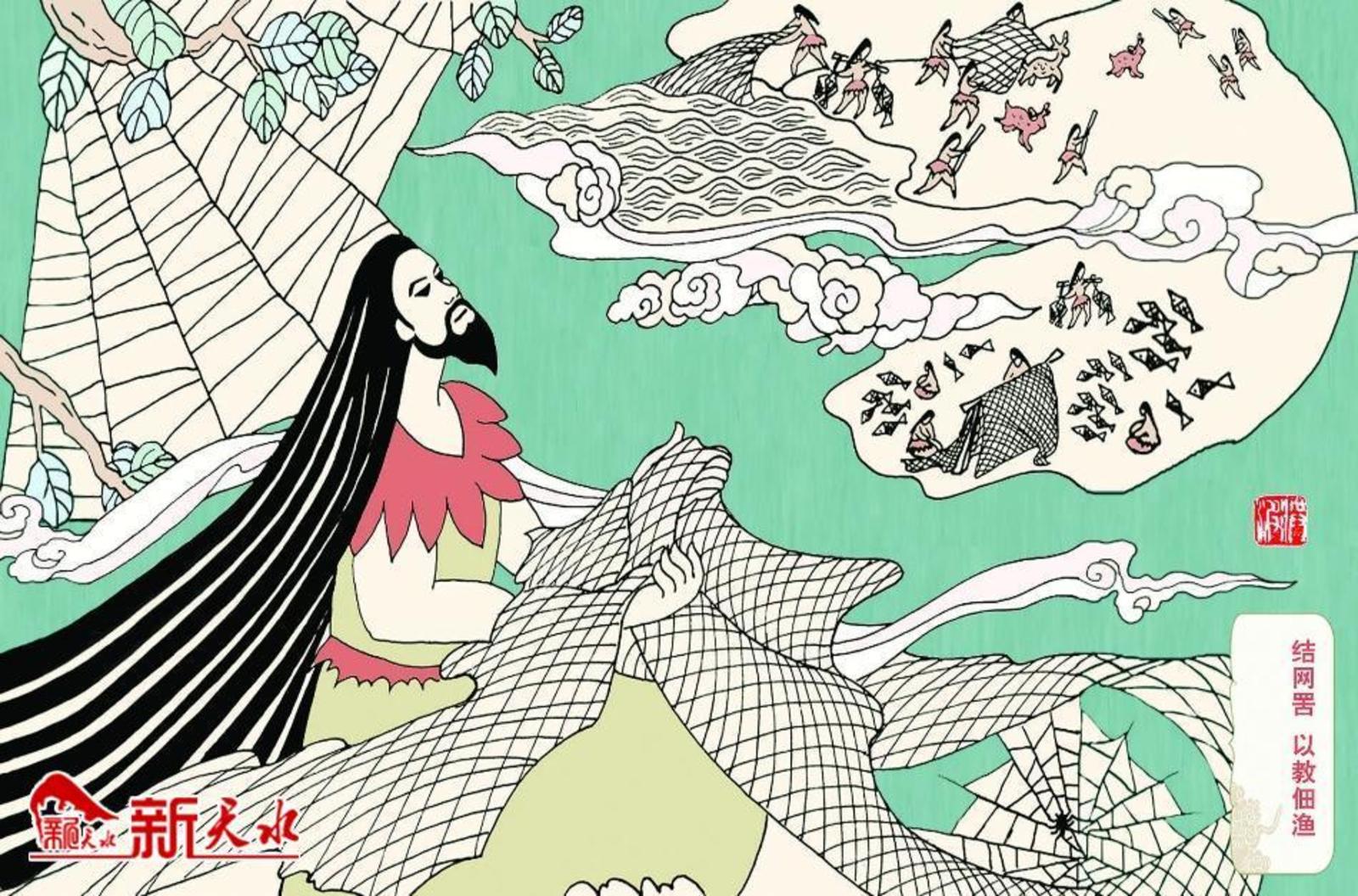 之后,大家又从伏羲编织的渔网中得到启发,并仿照他的方法编织出了鸟网,人们再用鸟网去捕鸟。这些发明创造,为改善人们的生活条件起到了积极作用。