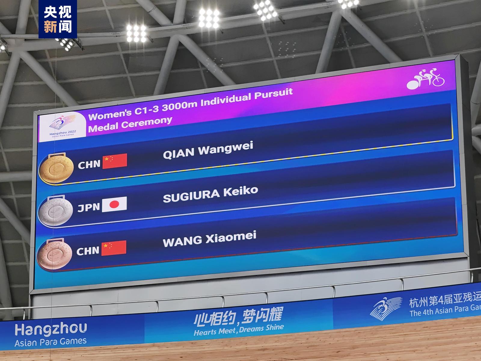 10月23日上午,杭州第4届亚残运会自行车赛事在淳安界首体育中心自行车馆开赛,在下午举行的女子个人C1-3 3000M追逐赛中,中国选手钱王伟打破亚残运会纪录,夺得金牌。