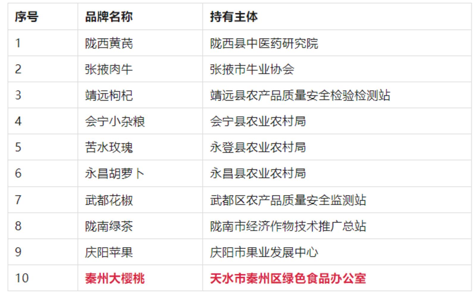按照《甘肃省农业农村厅关于开展“甘味”精品品牌创建活动的通知》(甘农市函〔2023〕15号)要求,经品牌主体申报、市(州)审核推荐、省级形式审查、专家评审,并综合新华网网络投票结果和品牌主体参与宣传推介活动情况,遴选出了“秦州大樱桃”等2023年“甘味”十大区域公用品牌、“李念祖”等100家“甘味”企业商标品牌,现予以公示,公示期5个工作日。如有异议请在公示期内,以书面形式实名反馈甘肃省农业农村厅市场与信息化处。
