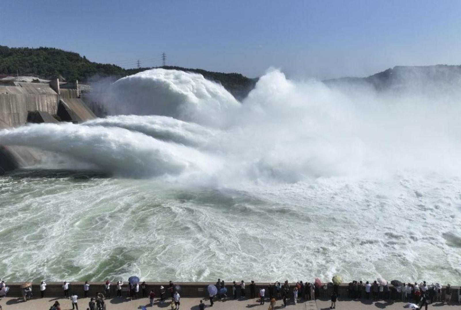 游客在黄河小浪底水利枢纽工程出水口观看调水调沙(2023年6月23日摄,无人机照片)。新华社发(苗秋闹 摄)