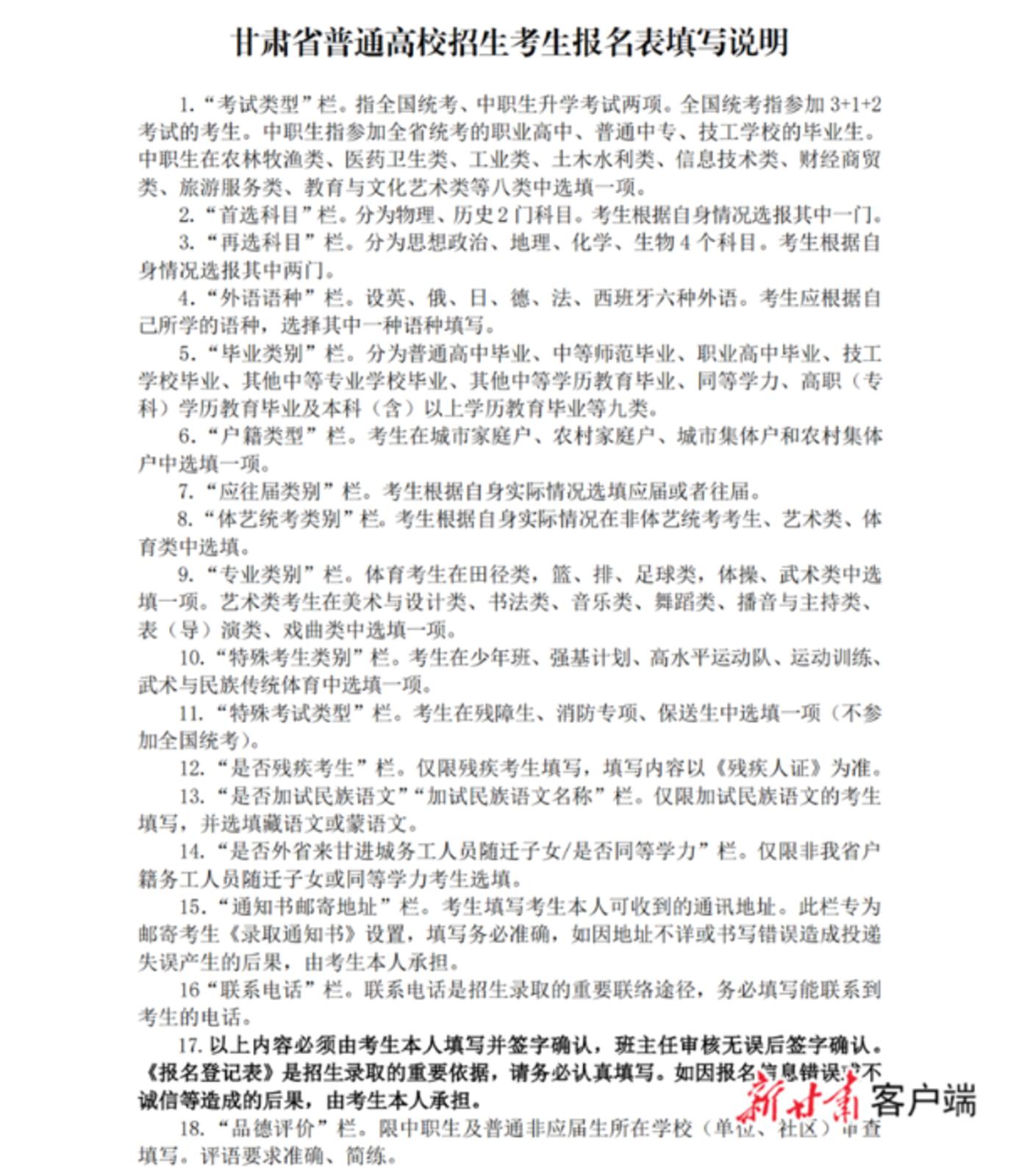 “网上报名”环节定于11月1日至10日进行,考生登录省教育考试院官网,根据《甘肃省国家教育考试综合管理平台-考生端用户使用手册》,按照流程即可完成报名;“现场确认及资格审查”环节定于11月25日前完成,考生须到报考地所在县(市、区)教育考试招生机构或指定地点按照要求进行报名资格审查、获取考生号、照相、进行指纹采集;“专项资格确认及照顾政策资格申报”环节定于11月30日前完成,考生可根据自身所具备的条件申报相应的照顾加分资格;“上传资料”环节,考生须在网上下载打印相关表格,并由相关部门审核确认,各报考单位将于2024年1月底前完成资料上传。