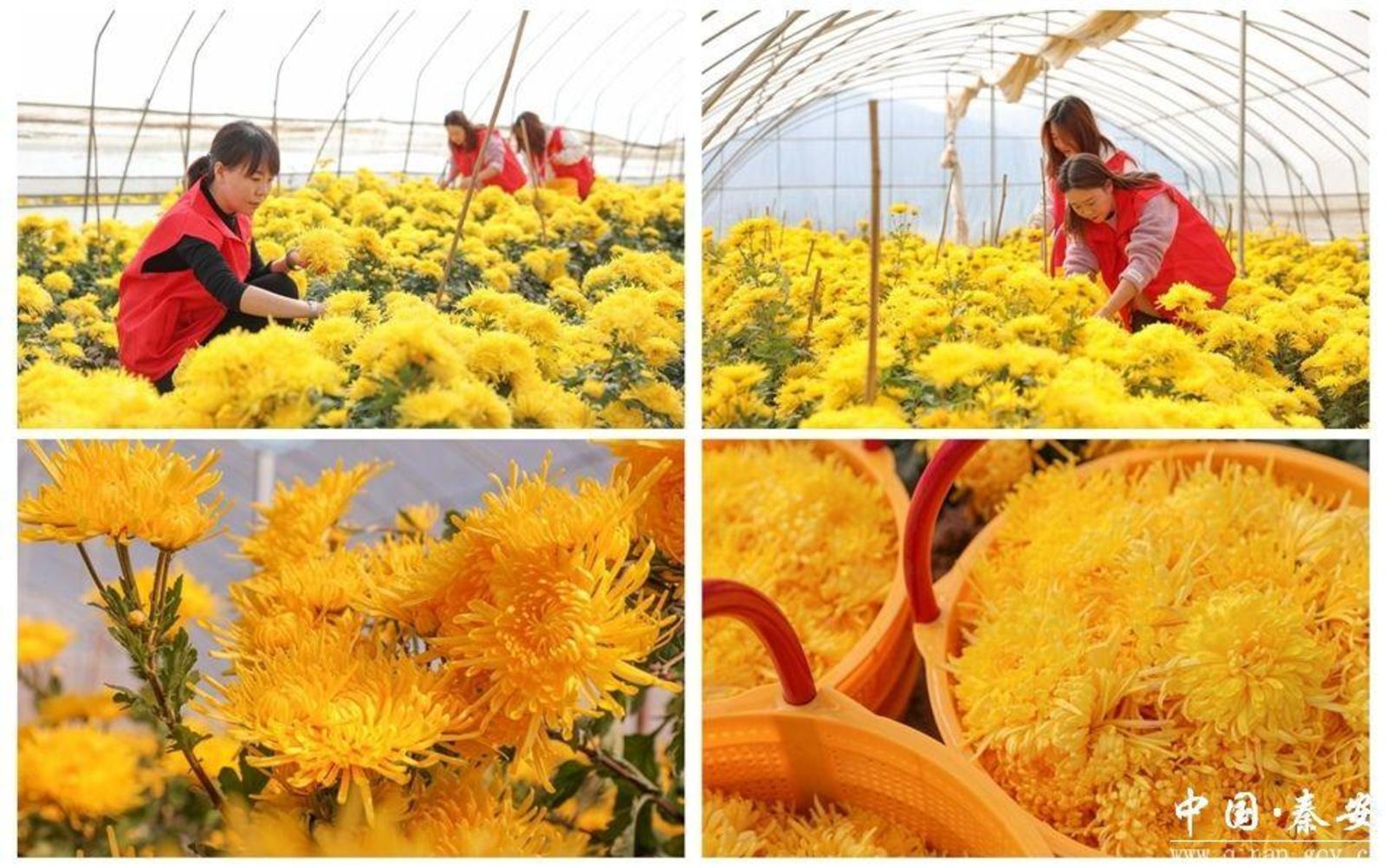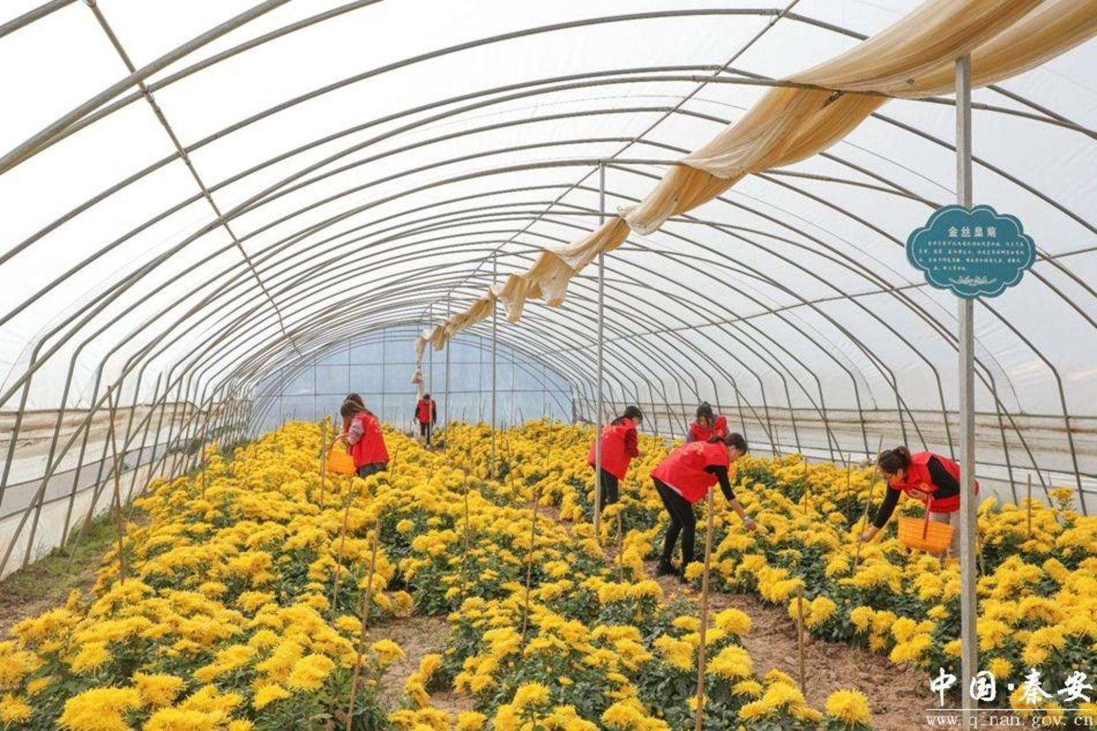 “五营镇在雒塬村租用闲置大棚38座,将8个非重点帮扶村联合起来,组建联合党支部,在大棚内发展种植金丝皇菊。经过去年第一次种植金丝皇菊,我们掌握了种植技术,优化了销售渠道,今年我们继续以‘党建+合作社’的模式种植金丝皇菊38棚。目前全部进入采摘期,预计收入达36万元。”五营镇雒塬村金丝皇菊种植基地负责人宋艳红说。