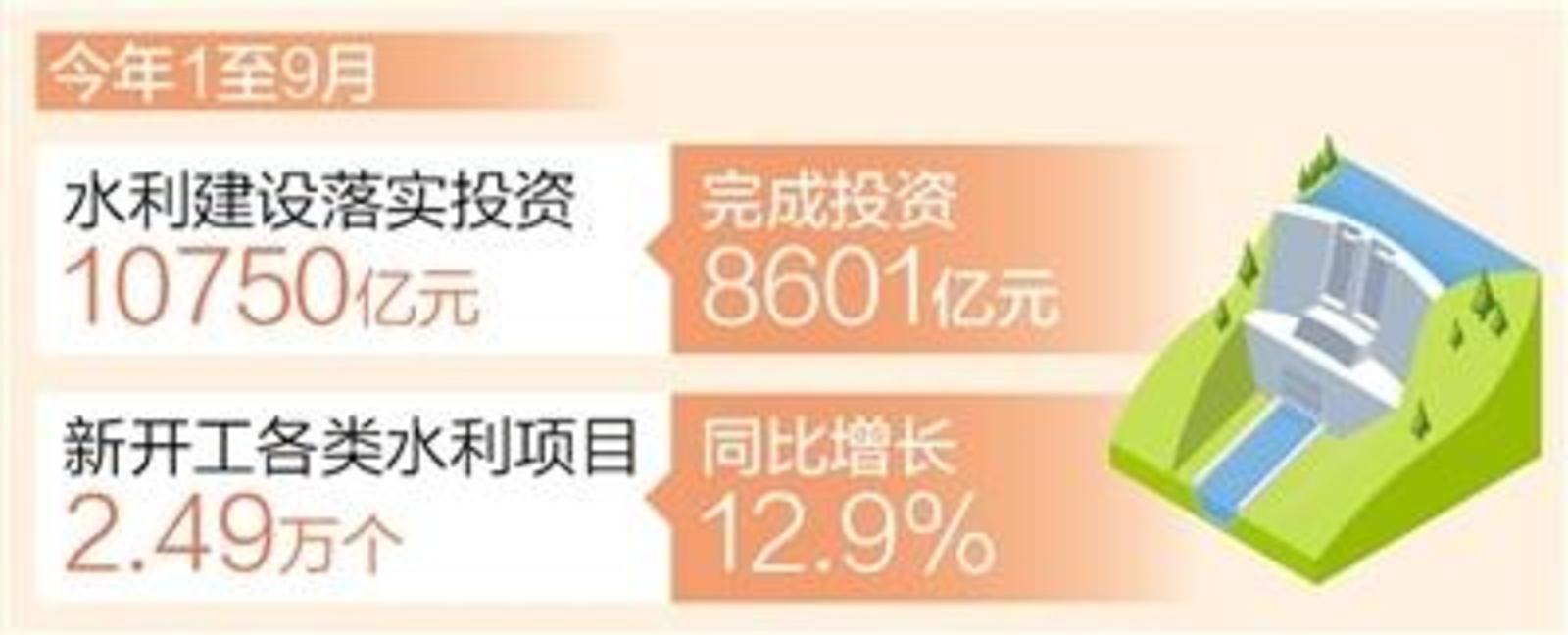记者近日从水利部获悉:今年1至9月,水利建设落实投资10750亿元,完成投资8601亿元,均创历史同期最高纪录。全国新开工各类水利项目2.49万个,同比增长12.9%;总投资规模1.15万亿元,同比增长8.9%。