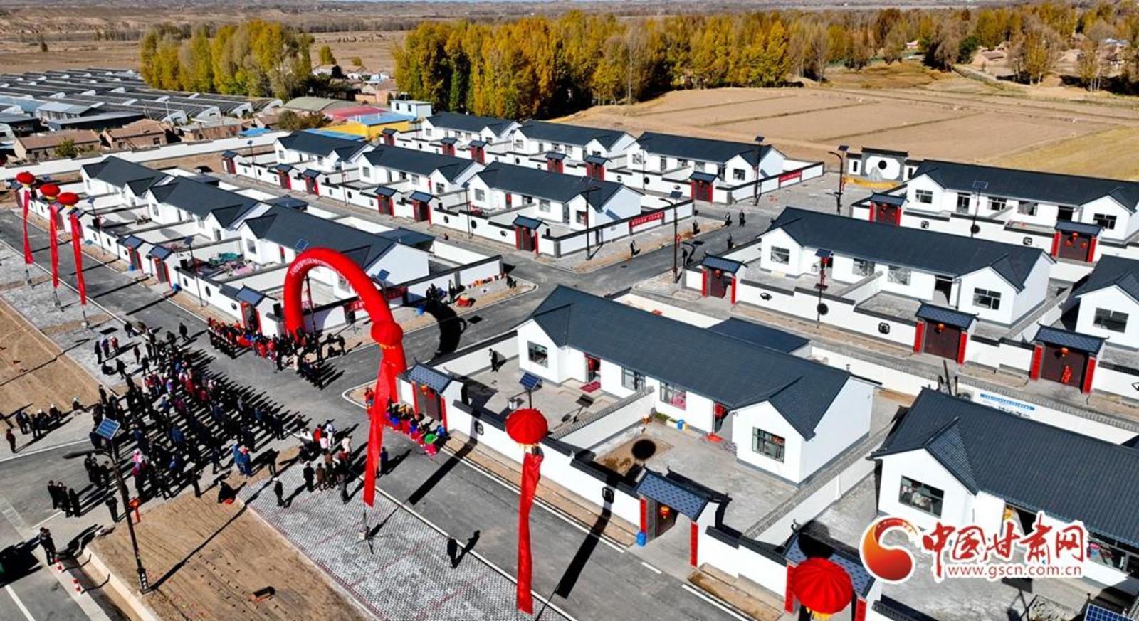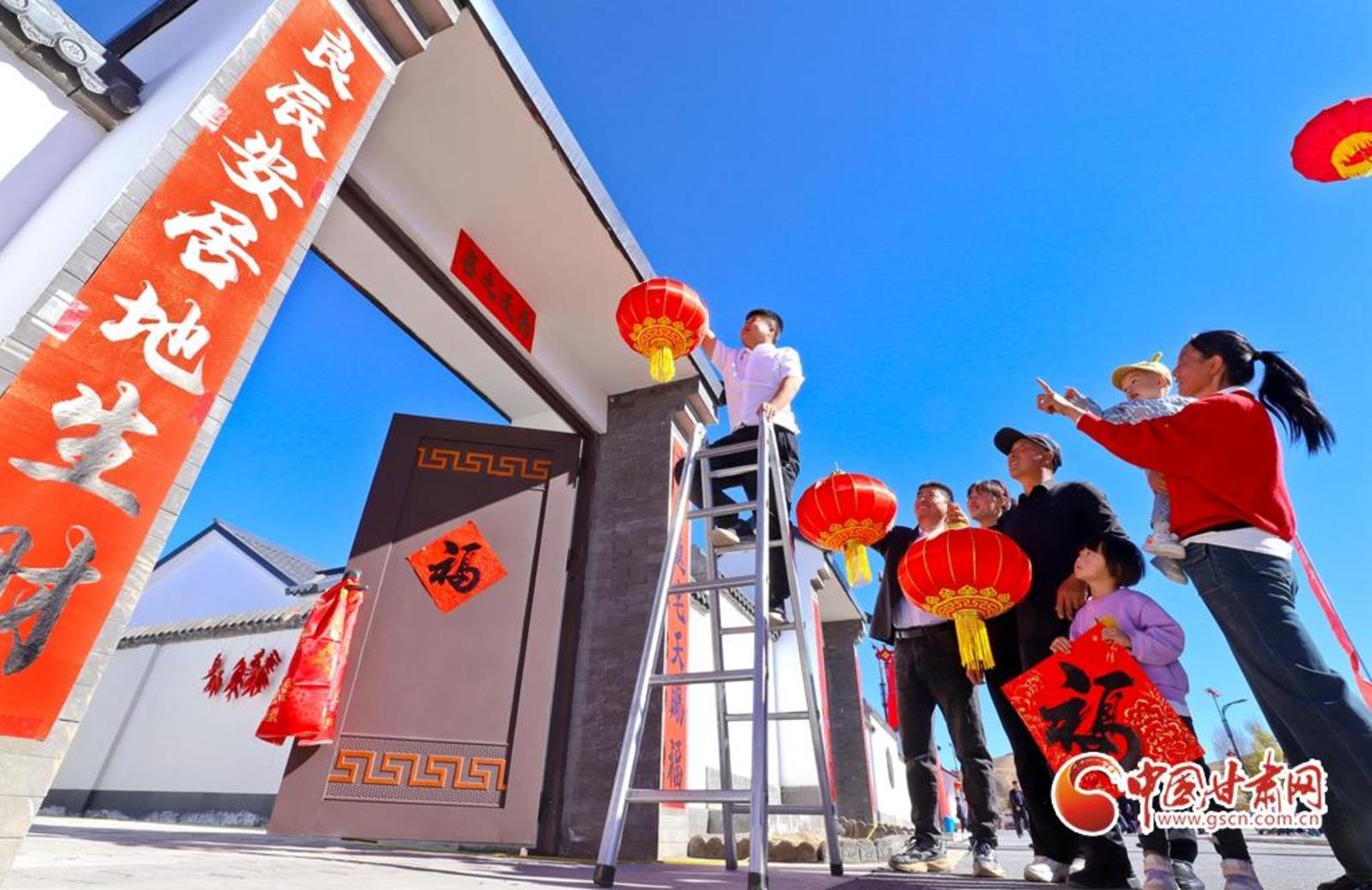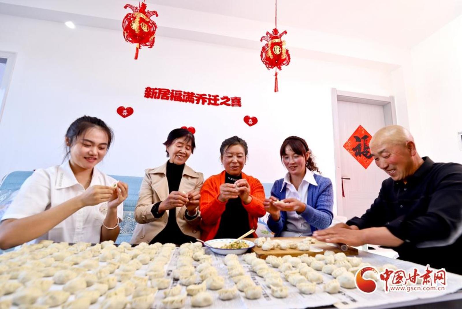 11月1日,在甘肃省张掖市山丹县大马营镇花寨村生态及地质灾害避险搬迁集中安置点,30户村民高兴地贴对联、挂灯笼、舞祥狮、包饺子,欢欢喜喜地搬进宽敞明亮、水电暖一应俱全的安居新家。