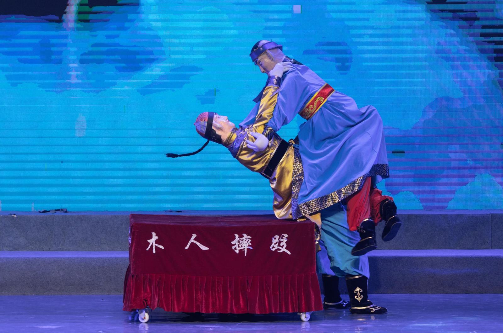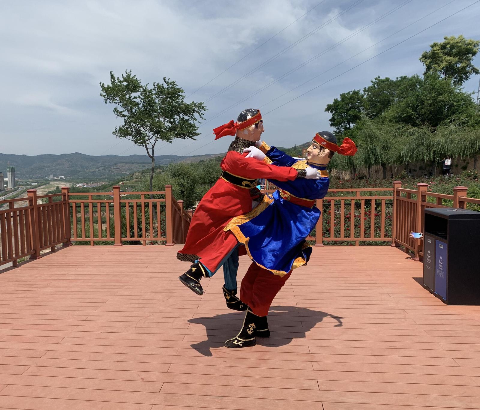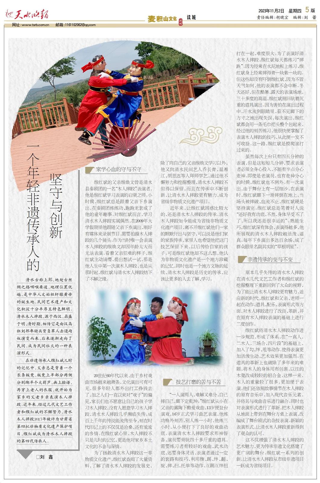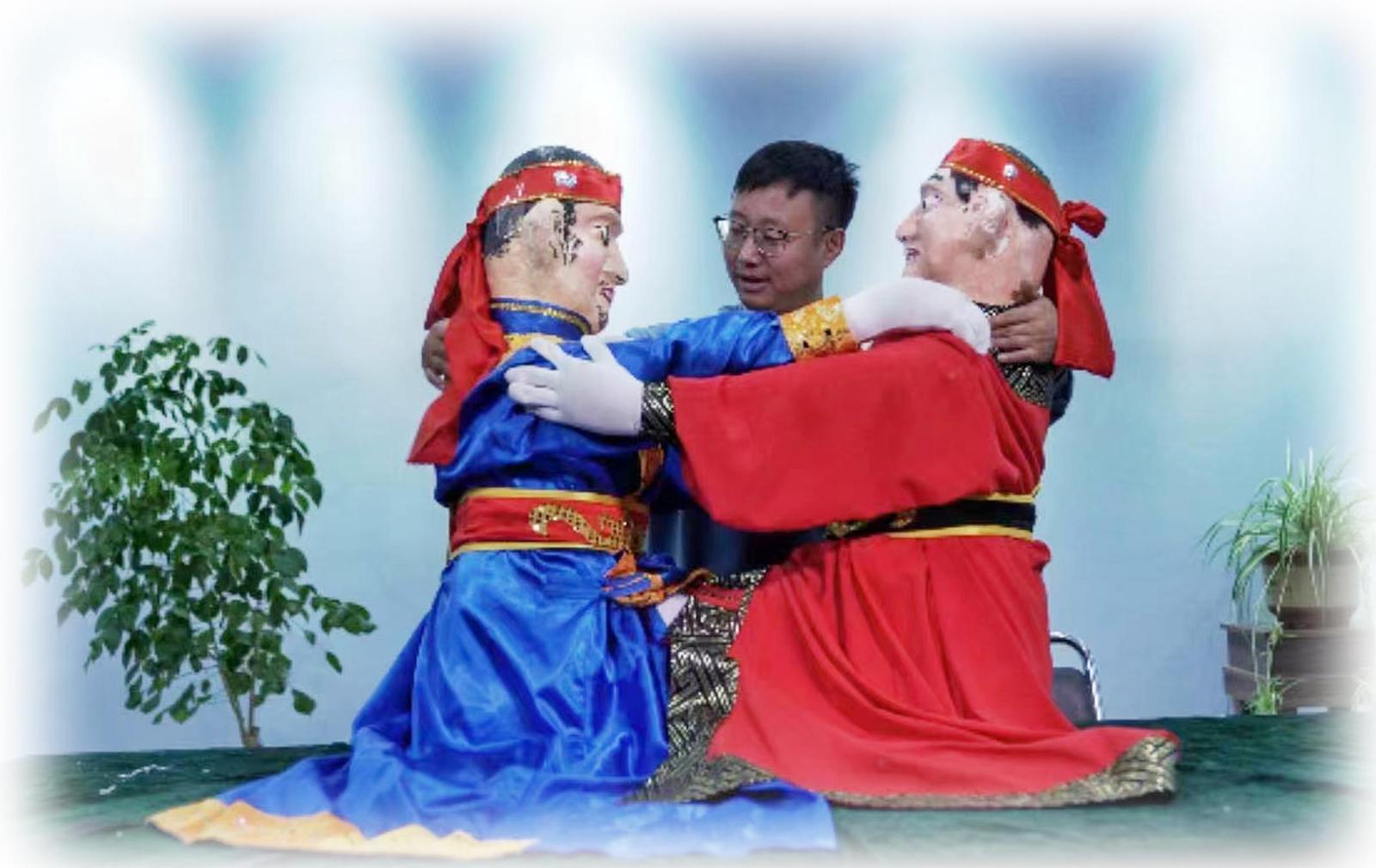 在非遗传承人缑红斌儿时的记忆中,父亲总是背着一个长条板凳,板凳上半部分两侧分别绑半个大葫芦,画上脸谱,再穿上老人的衣服,就开始为家乡的父老乡亲表演木人摔跤。近年来,经过几代文艺工作者和缑红斌的不懈努力,清水木人摔跤2017年被评为甘肃省第四批非物质文化遗产保护项目,缑红斌成为清水木人摔跤的第四代传承人。