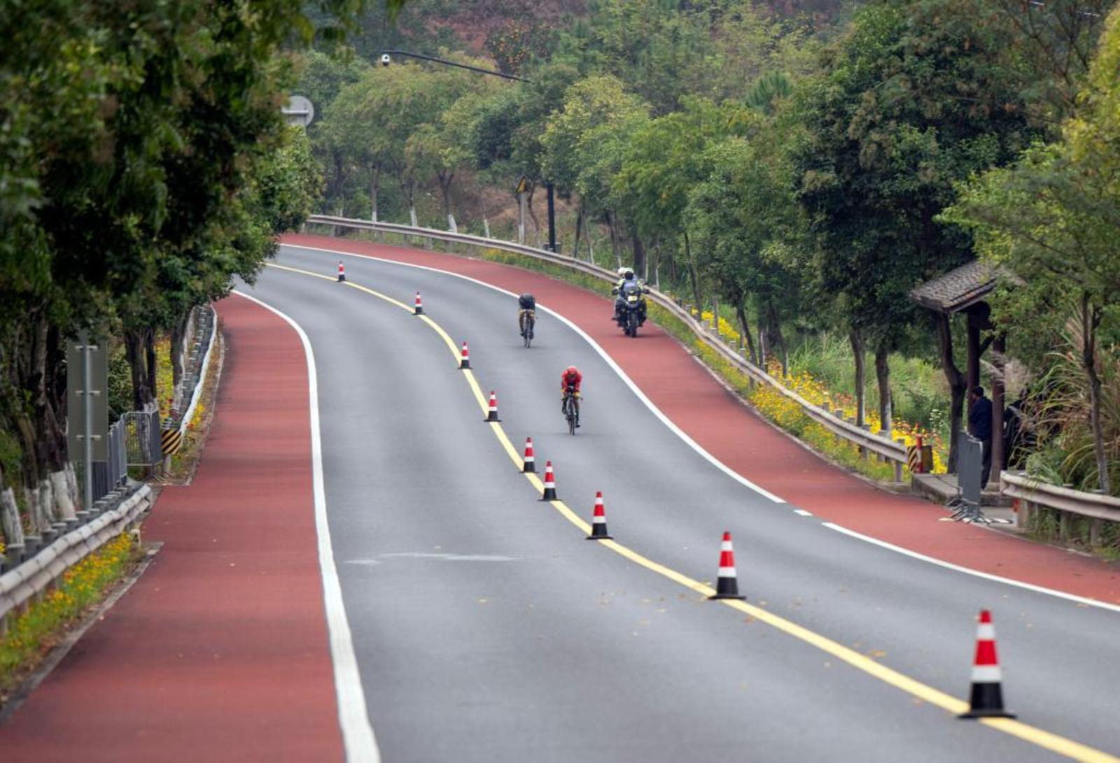10月26日,亚残运会公路自行车的选手们在淳安界首体育中心公路自行车赛场的赛道上。新华社记者 才扬 摄