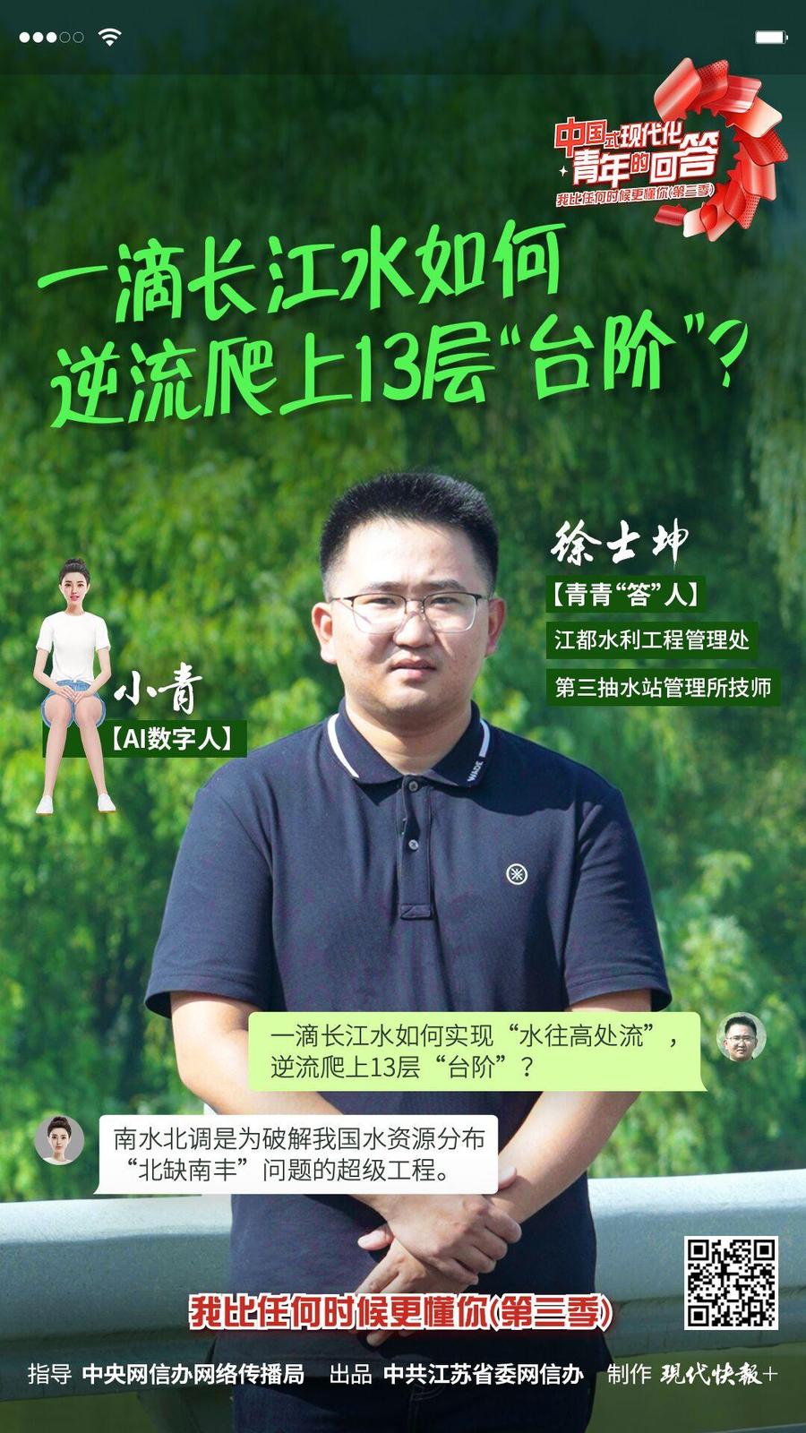 11月4日,“中国式现代化·青年的回答——我比任何时候更懂你(第三季)”系列短视频之《一滴长江水如何逆流爬上13层“台阶”?》正式上线。在本集视频中,青青“答”人——江苏省江都水利工程管理处第三抽水站管理所技师徐士坤携手AI数字人小青,带领大家打卡江都水利枢纽,解密一滴长江水如何逆流爬上13层“台阶”。