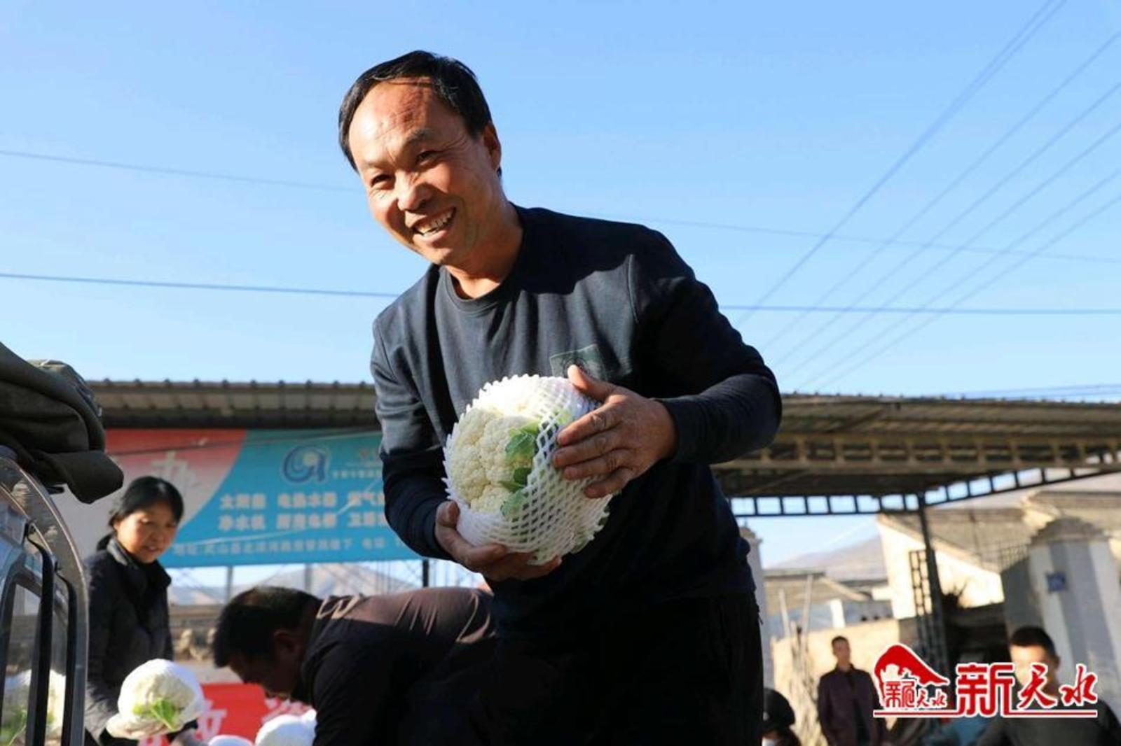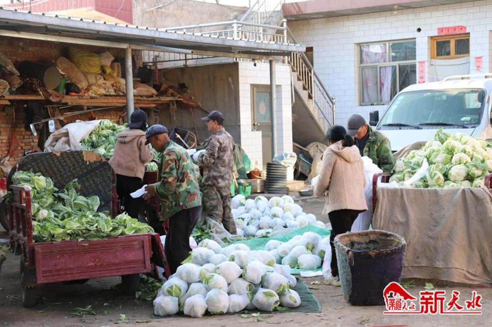 新天水讯【通讯员杨耀斌 管秋勇】深秋时节,武山县山丹镇车岸村的400亩菜花成熟,放眼望去,绿色的叶子里包裹着白嫩的花心,煞是惹人喜爱。趁着晴好天气,菜农抓紧时间采收,收割、装筐、搬运,一气呵成,一派丰收景象。