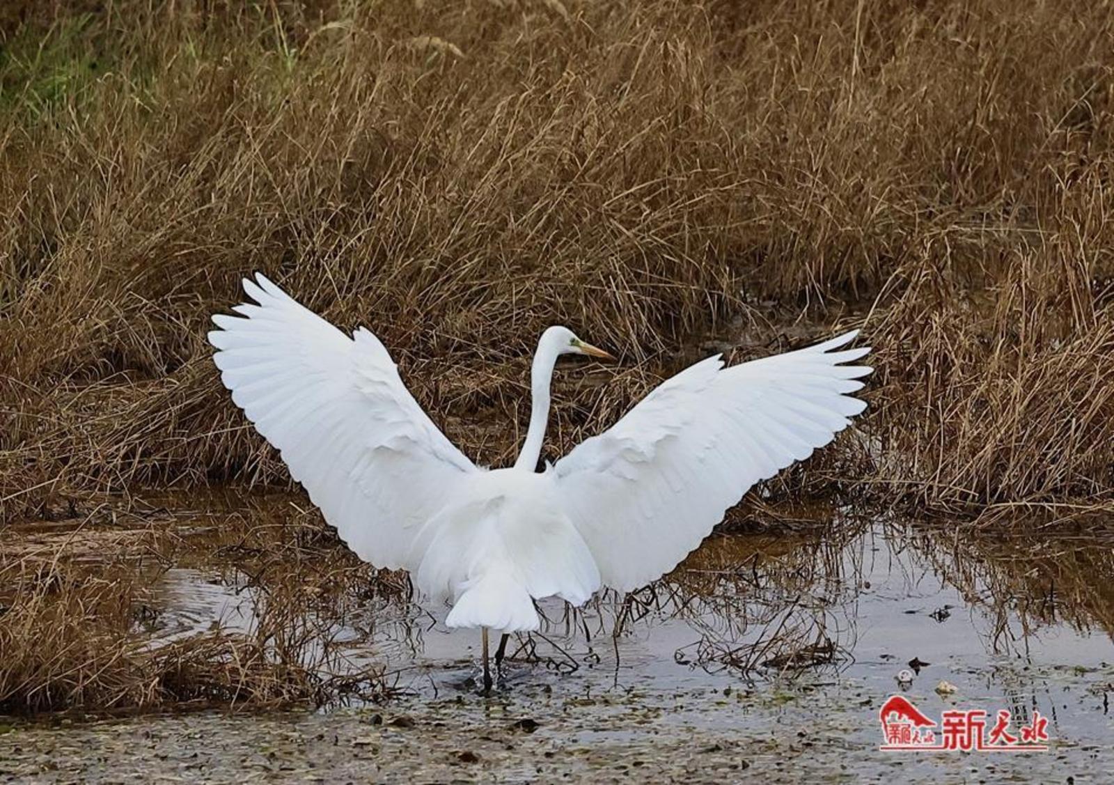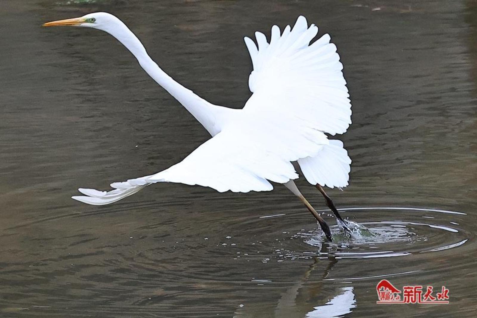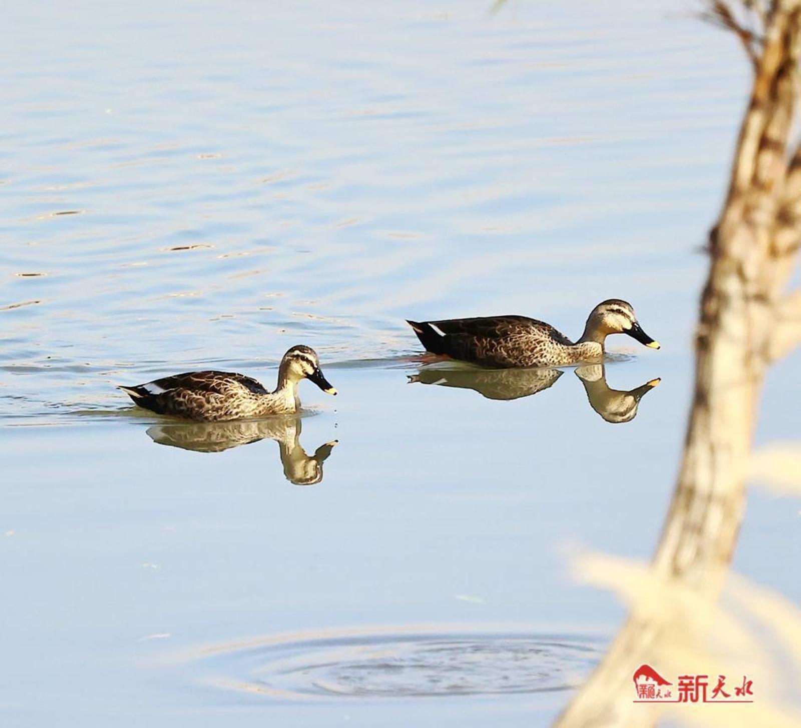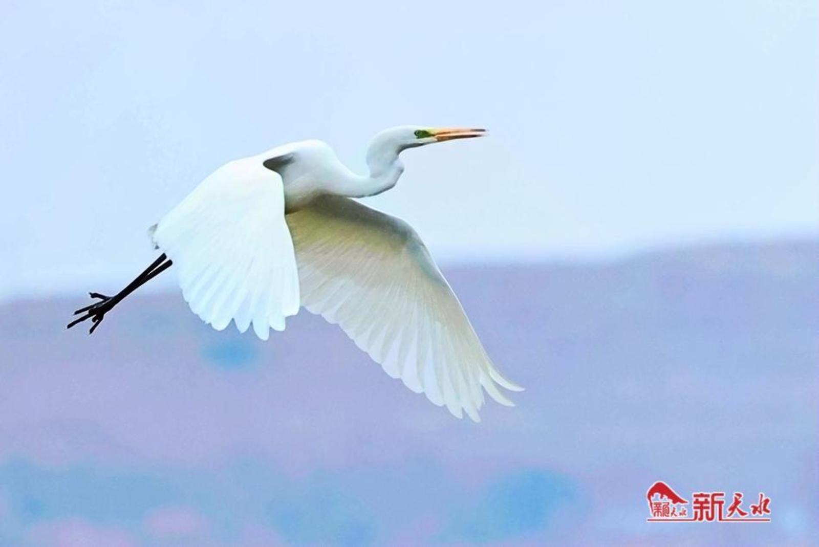 11月25日,初冬的武山县大南河河畔,碧波荡漾,风景宜人。成群白鹭或盘旋飞舞,或逐浪嬉戏,鸭群对对成行、自由自在,河两岸蔬菜大棚里忙碌的人群和群鸟和谐相处,相映成趣,勾勒出了一幅人与自然和谐共生的美丽画卷。(康喜 摄)