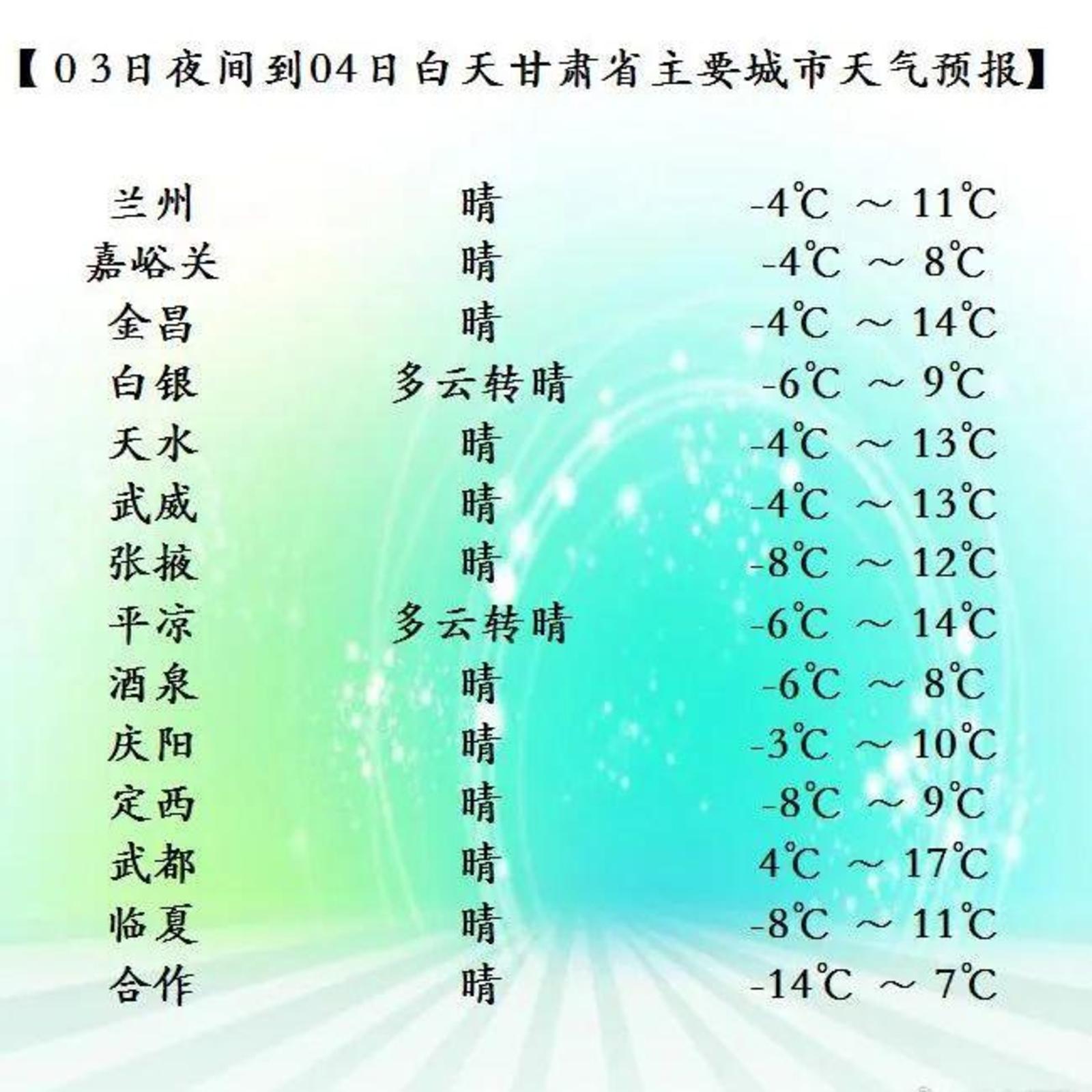 今天夜间到明天白天(12月03日20时-12月04日20时),全省各地晴或多云,其中酒泉市有4-5级西北风。