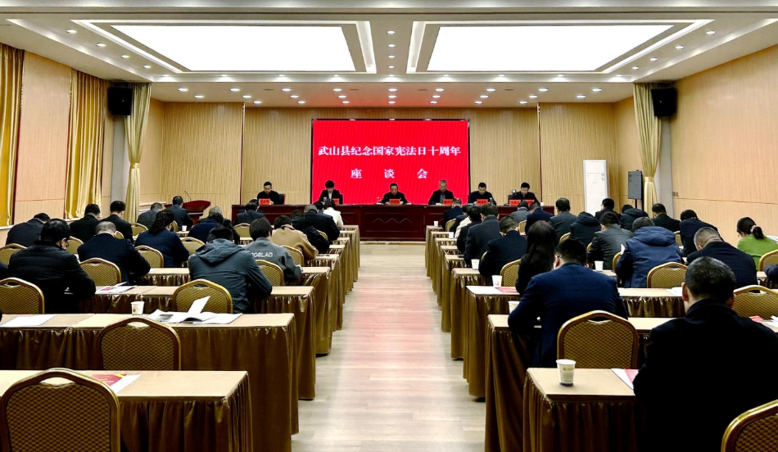 新天水讯 据武山县融媒体中心消息 为加强宪法宣传,强化宪法意识,弘扬宪法精神,维护宪法权威,12月4日,武山县召开纪念国家宪法日十周年座谈会。县人大常委会党组书记、主任孙德银出席会议并讲话。县人大常委会副主任骆育喜、李燕玲、韩永红、张志林参加会议,县人大常委会副主任郭海涛主持会议。
