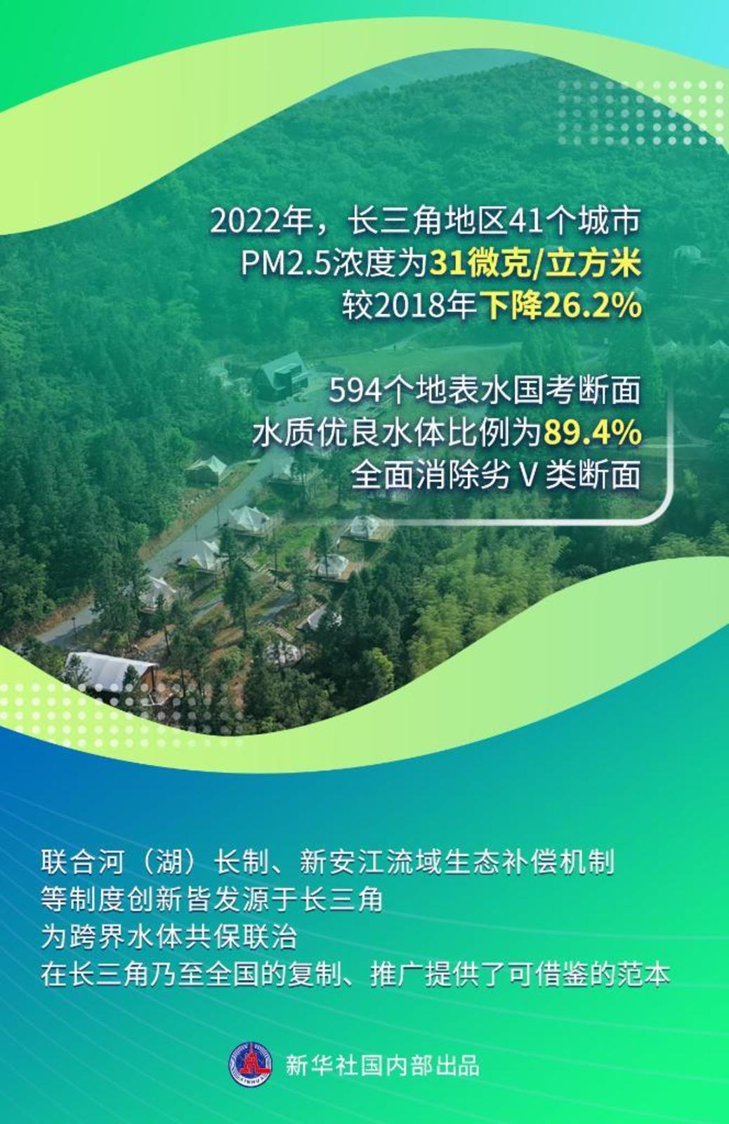 2022年,长三角地区41个城市PM2.5浓度为31微克/立方米,较2018年下降26.2%。594个地表水国考断面水质优良水体比例为89.4%,全面消除劣Ⅴ类断面。