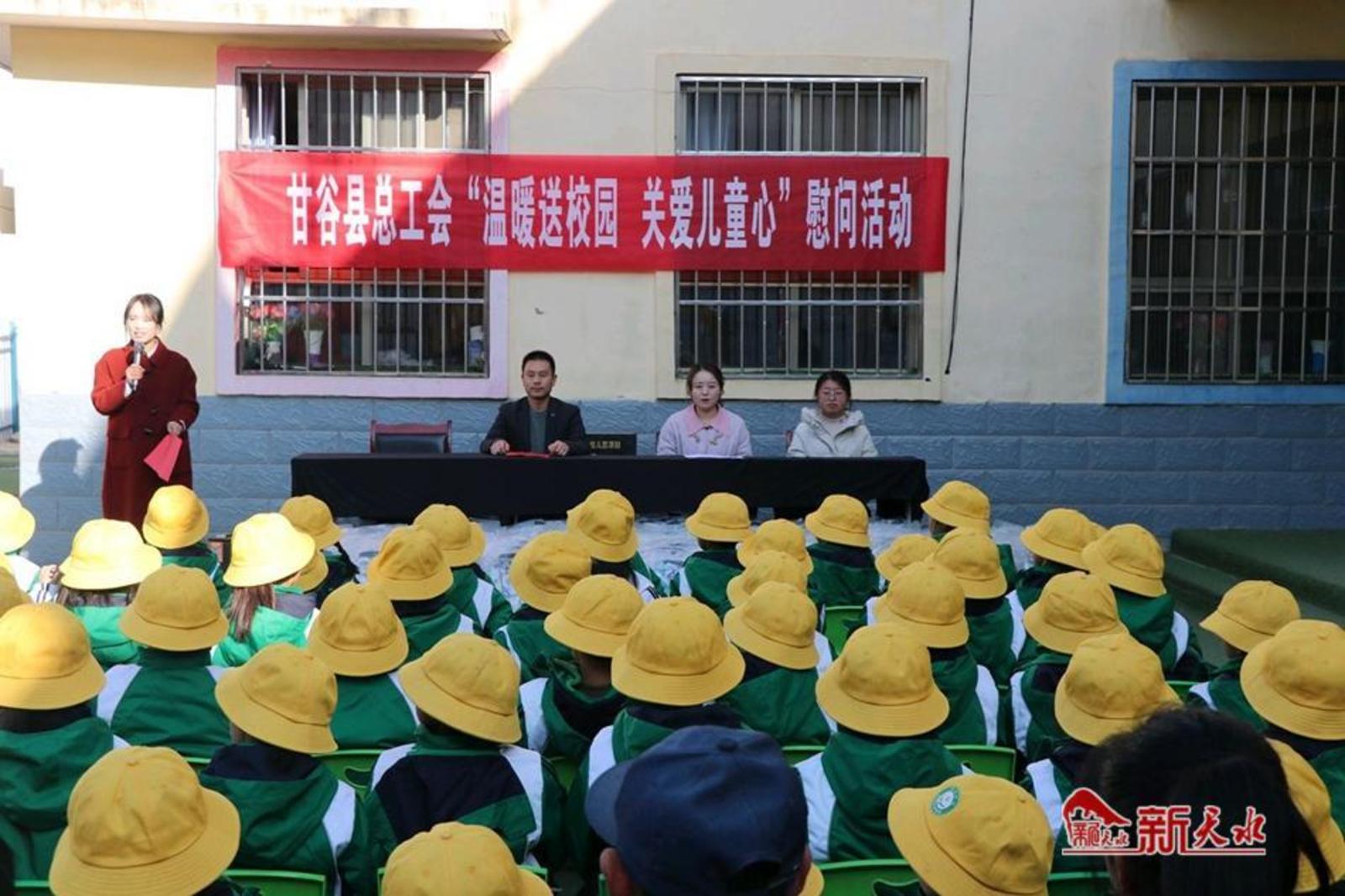 新天水讯 12月4日,甘谷县总工会深入永安伏羲学校附属幼儿园开展“温暖送校园 关爱儿童心”慰问活动,为109名学生送去书包、笔盒、跳绳、彩笔等物品,并详细了解了学生的学习生活情况,鼓励他们要树立远大理想,养成优良品德,从小事做起,勤奋自立、乐观向上,致力成为建设祖国的栋梁之才。(柳桐)