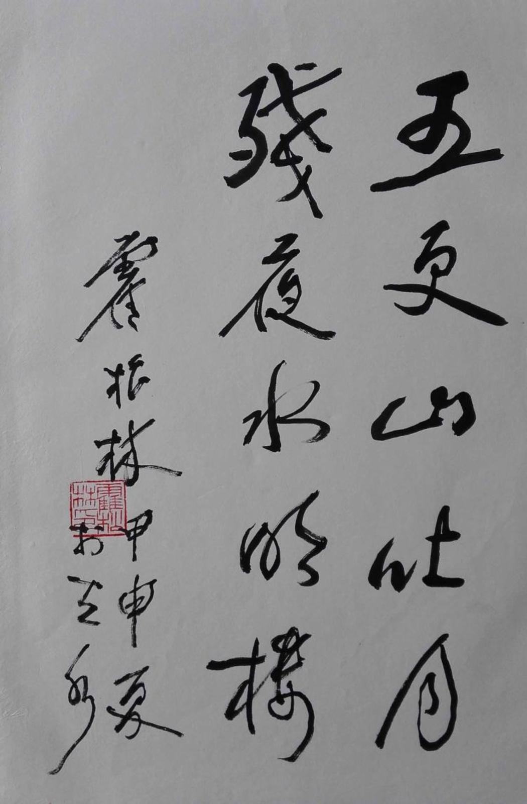 这天傍晚,我和小苏还各求得霍老一帧墨宝,写在二号册页上,内容都取自杜甫《秦州杂诗》,足见先生对老杜流寓天水的这组诗感情之深。给小苏写的是“无风云出塞,不夜月临关”,给我写的是“五更山吐月,残夜水明楼”。写的时候说:“年龄大了,手抖。”