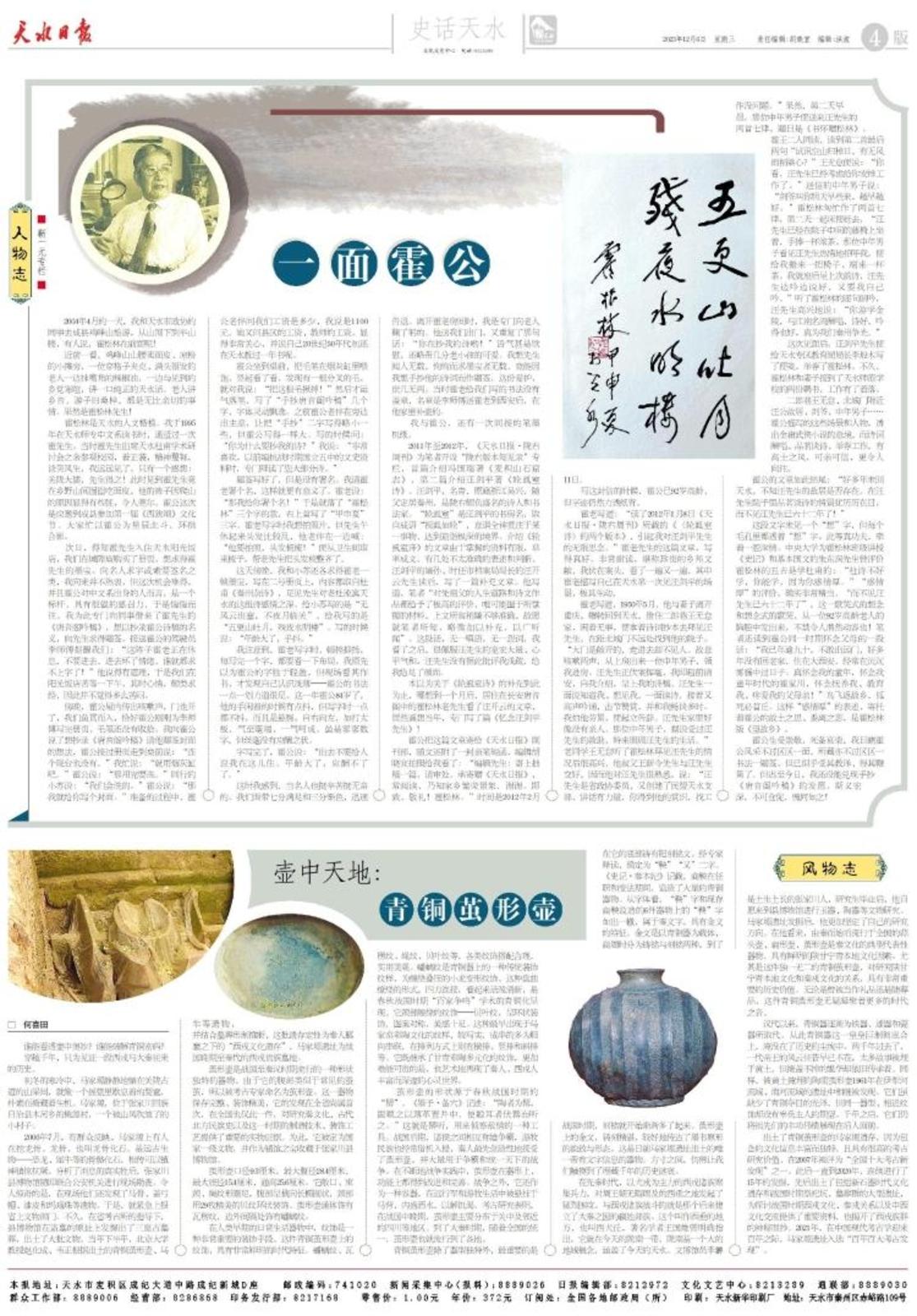 霍公把这篇文章寄给《天水日报》副刊部,随文还附了一封亲笔短函,编辑胡晓宜拍照给我看了:“编辑先生:寄上拙稿一篇,请审处。承寄赠《天水日报》,常阅读,乃知家乡繁荣景象,谢谢。即致,敬礼!霍松林。”时间是2012年2月11日。