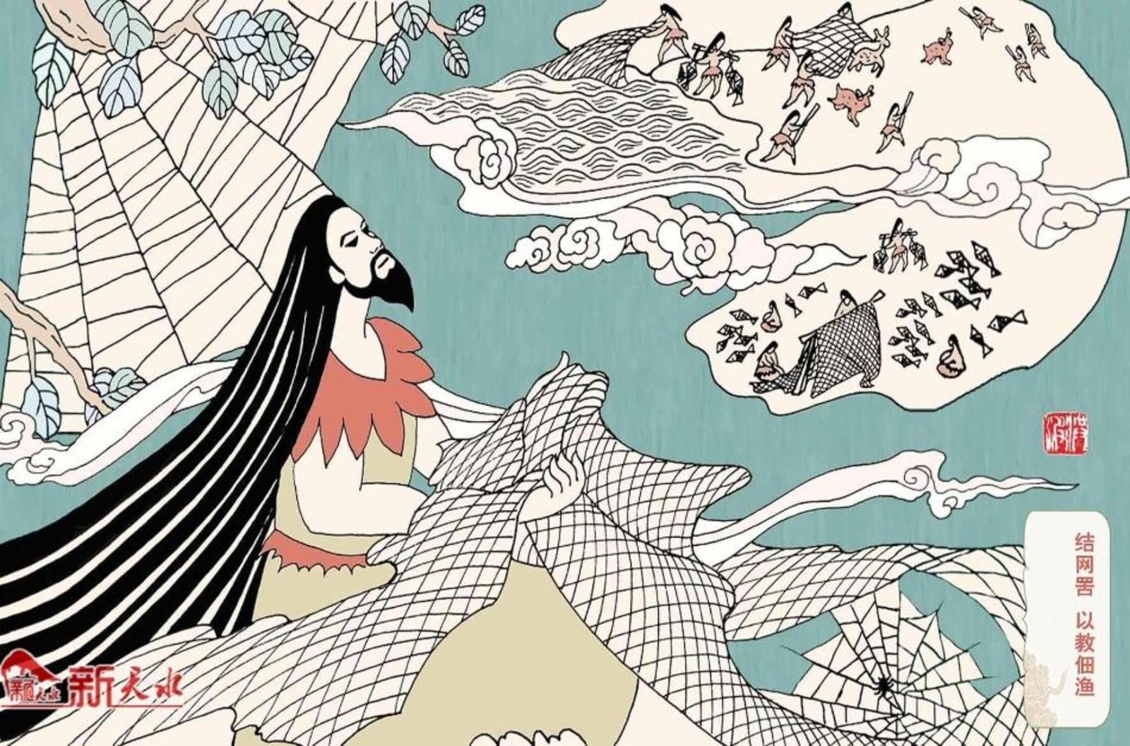 双方争执不下时,龙王忽然看到,人类捕鱼皆是跳入水中,于是灵机一动对伏羲说:“人类可以捕鱼,但却不能踏入水中。”伏羲本来就不占理,听龙王这么说,便也答应了下来。可是不准下水捕鱼,这件事却愁坏了伏羲。不下水如何捕鱼,捕不到鱼,人被饿死的问题仍旧不能解决啊!伏羲皱着眉头在岸边徘徊,忽然发现了树上蜘蛛结网的情景。只见蜘蛛在树枝中间拉着丝,左一道、右一道,慢慢地结成了一张巨网,之后蜘蛛便躲在了一边。当周围的蚊子、苍蝇、蝴蝶飞来的时候,一不小心落在了网上,蜘蛛才会慢慢地爬出来饱餐一顿。