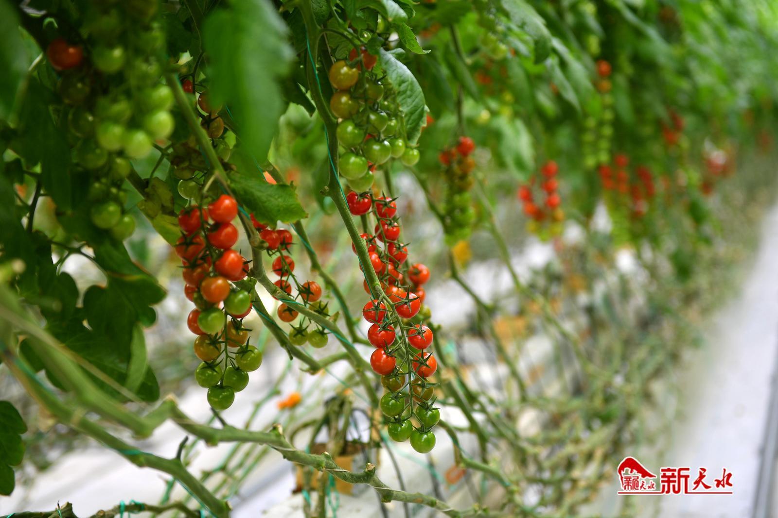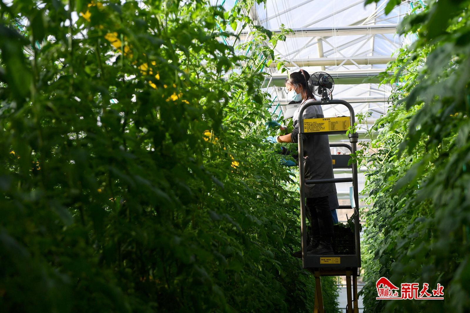 在恒硕源农业发展有限公司智能联动温室内,一串串玛瑙般的樱桃番茄挂满枝头,务工人员忙着打杈、盘头、清理落叶,在精细化、科学化管理下,确保樱桃番茄品质优、产量高。