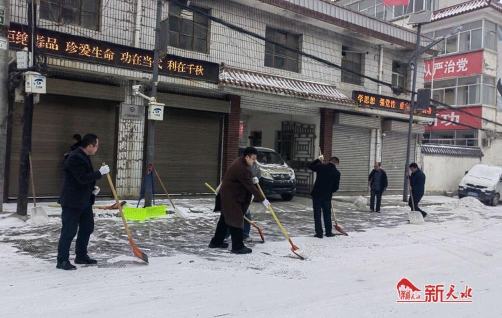 图为武山县杨河镇组织党员干部清扫路面积雪。(康宁 摄)