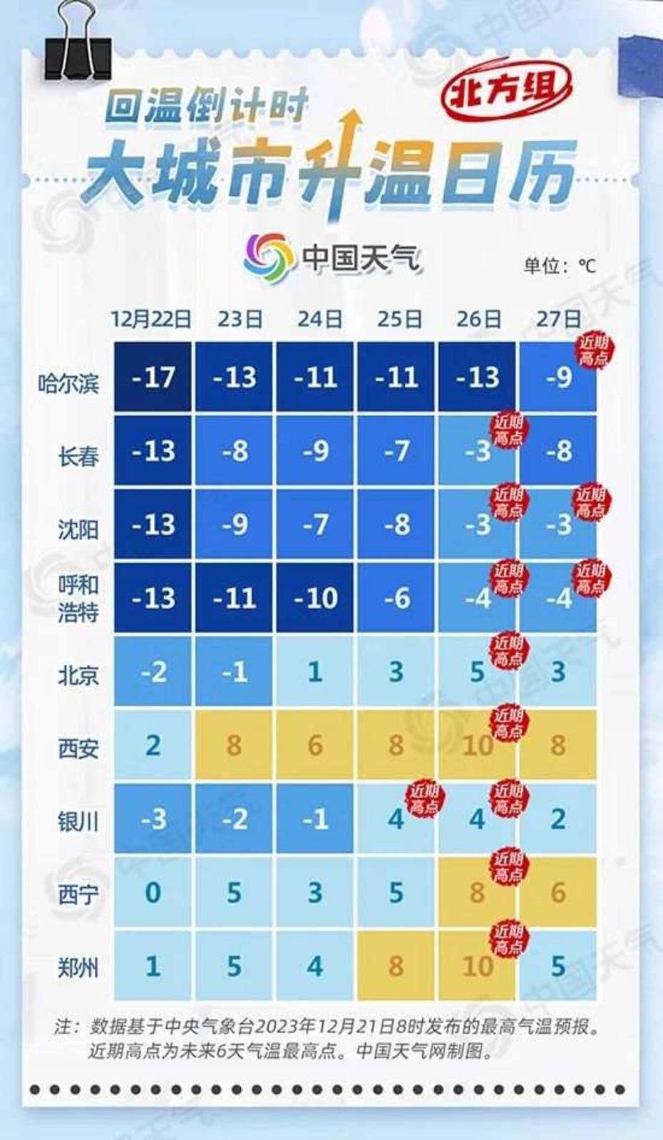 从中国天气网推出的大城市升温日历可以看到,明天,北方大部率先升温,大城市中,西安、郑州最高气温将重回冰点以上。到了本周末,西安最高气温或达8℃,北京最高气温也可能升至0℃以上,长春升至-7℃左右,基本回到与常年同期持平的状态。下周初,各地气温将纷纷升至近期高点,26日,西安、郑州最高气温或达10℃,北京最高气温将有5℃,长春、呼和浩特回升至-3℃左右;哈尔滨27日最高气温也将达到-9℃,较常年同期偏高。
