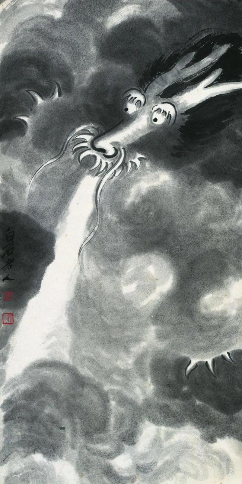 在《十二属图》的《云龙图》中,齐白石一反传统绘画作品中表现怒目瞪眼、张牙舞爪、威武勇猛的巨龙形象,满幅构图,画面的大部分空间晕染翻滚的乌云,意在烘托龙的活动氛围。巨大的龙首在浓云之中闪现而出,双目圆睁,焦墨点睛;其角其眉,颇有几分卡通意味;龙须飘逸,龙嘴之下,一道如瀑白光倾泻而下;两只三爪龙足,上下对角,隐约可见,为画面纾解了凶猛之气,平添了几分童趣,显得可亲可爱,如同一位慈祥的神仙高居云端,悠闲自在,俯瞰人间,尽现安宁和祥瑞之相,为龙这一虚构之物赋予了可人形象。整幅作品疏朗简洁,云烟翻滚,浓淡相间,充分表现出巨龙灵动活泼的气势和尊荣高贵的神韵。