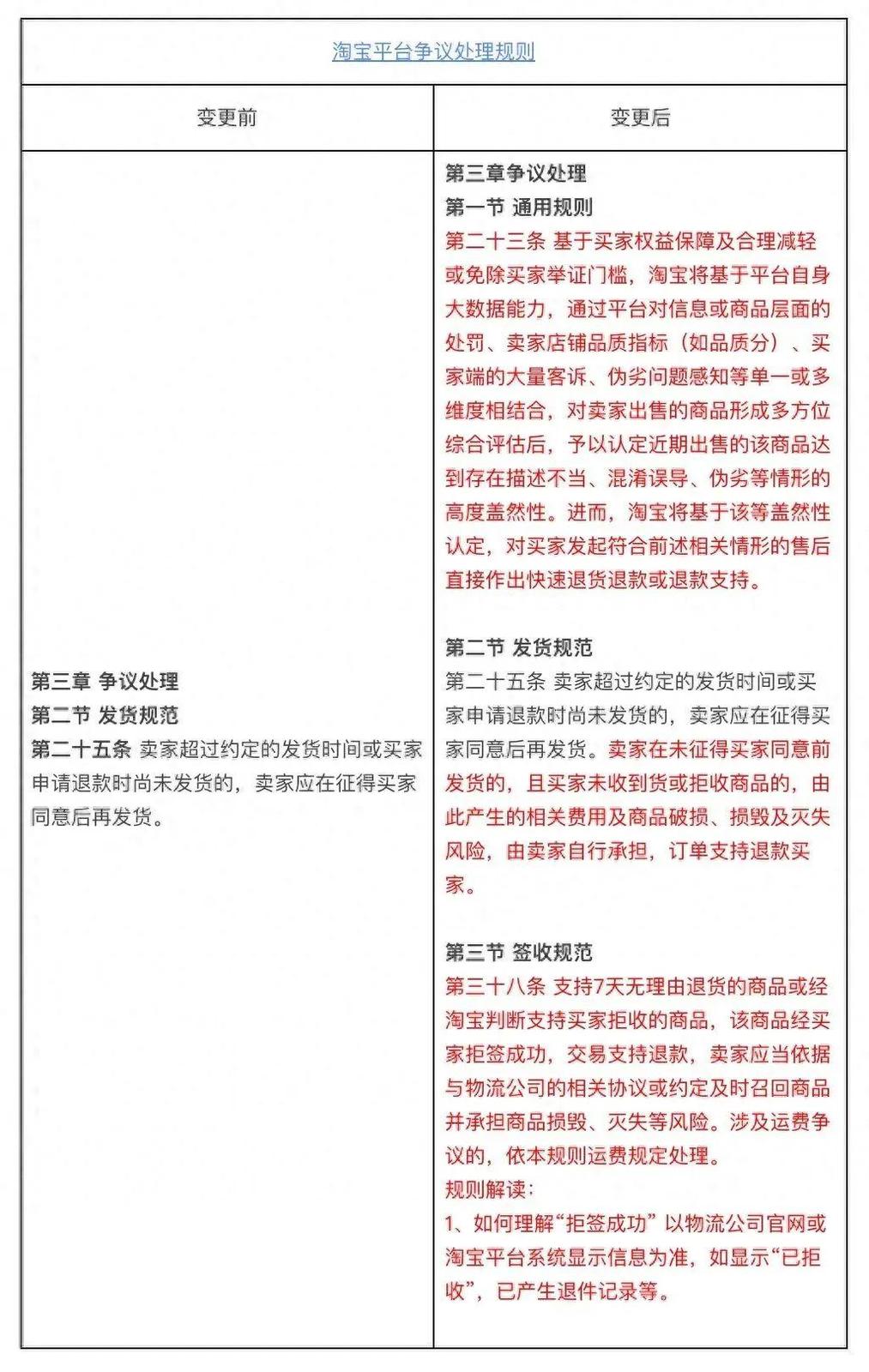 ● 第一条为“新增淘宝基于平台自身大数据能力,识别多维度结合,对于买家发起符合相关情形的售后,做出快速退款或退货退款的规则依据”。