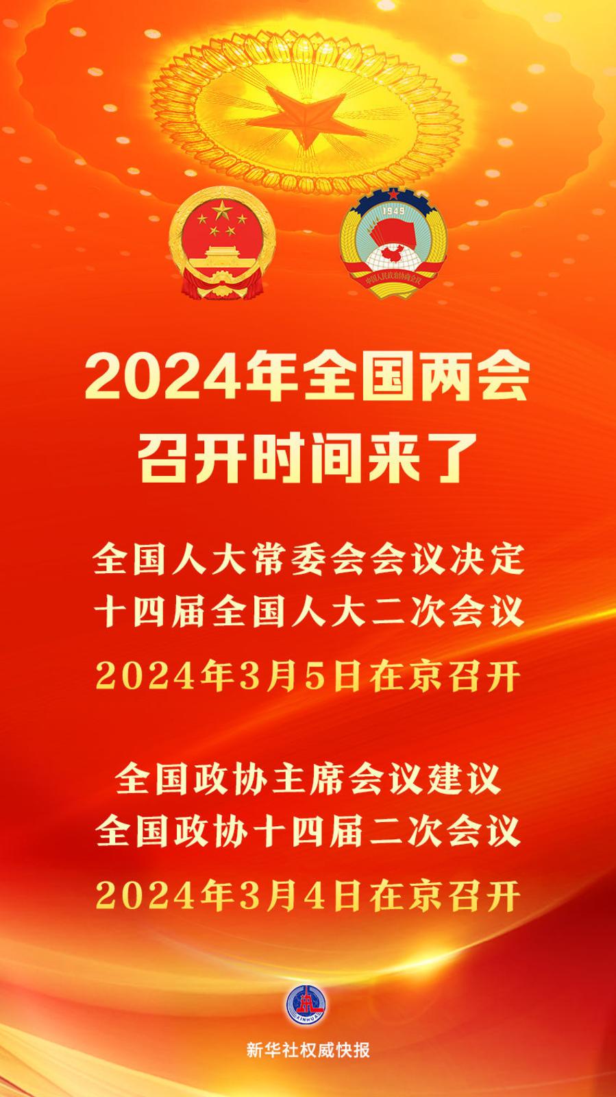 全国人大常委会会议12月29日表决通过了关于召开十四届全国人大二次会议的决定。根据决定,十四届全国人大二次会议于2024年3月5日在北京召开。政协第十四届全国委员会日前召开主席会议,建议全国政协十四届二次会议于2024年3月4日在北京召开。