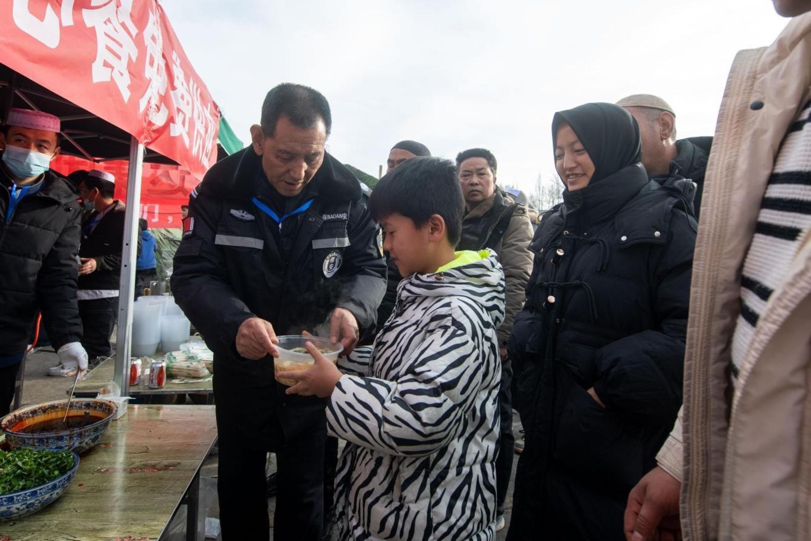 12月19日中午12时,甘肃省临夏州积石山县大河村集中安置点旁的“爱心餐”供应点排起了长龙,一碗碗热气腾腾的牛肉面让安置点暖意融融。