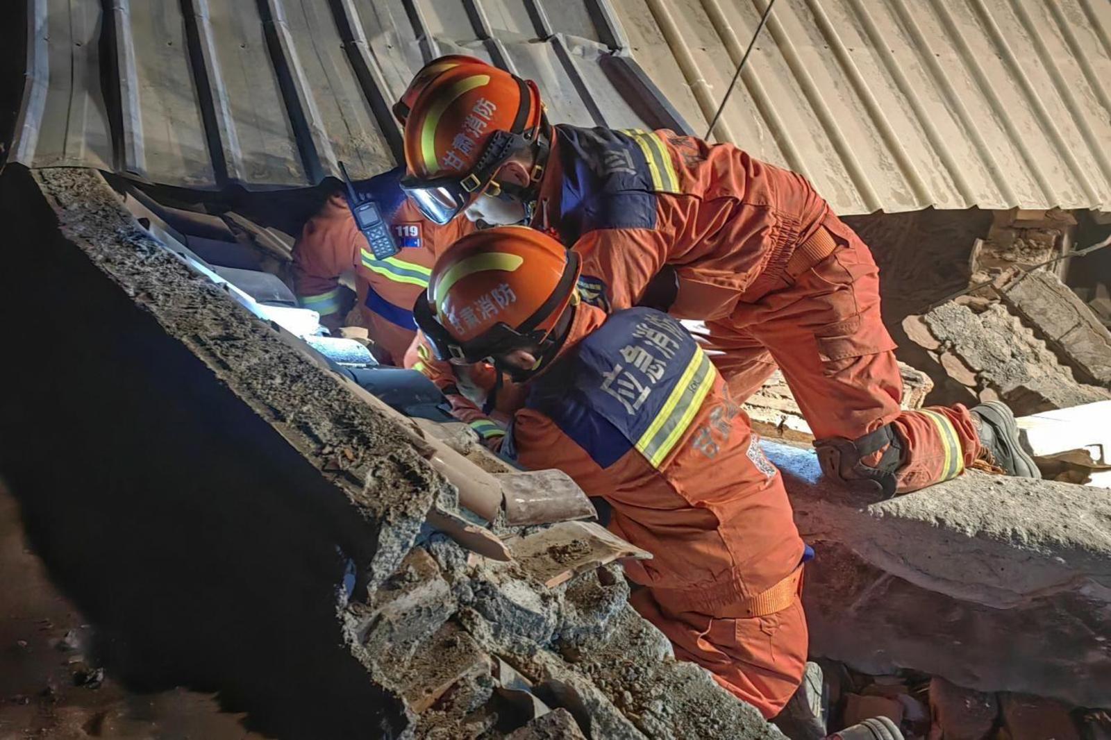 12月19日凌晨,甘肃临夏消防指战员在积石山县大河家镇陈家村进行紧张搜救。甘肃省消防救援总队供图