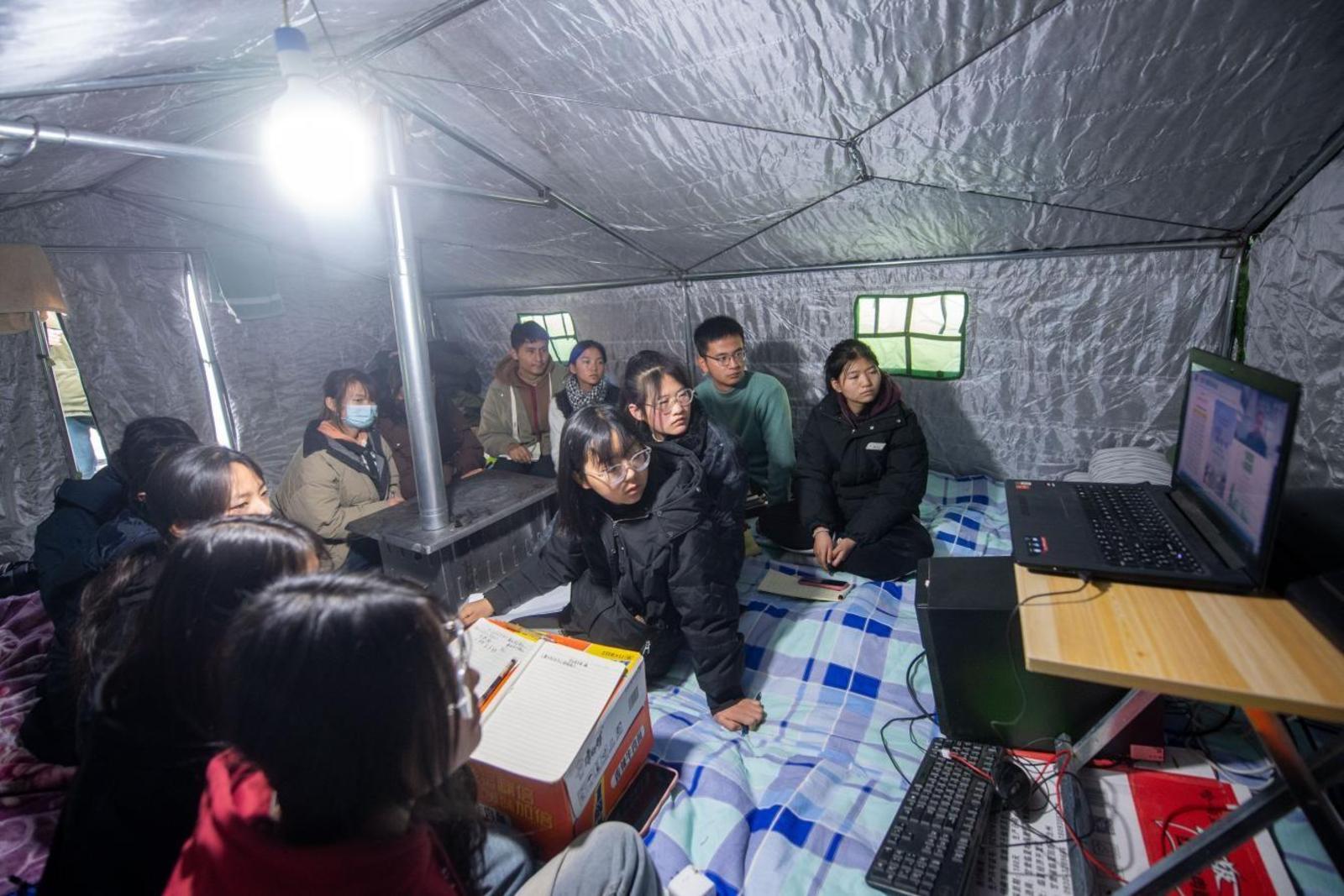 12月22日,在甘肃省临夏州积石山县大河家镇大河村集中安置点,部分高中学生在帐篷中听课。人民网记者 翁奇羽摄