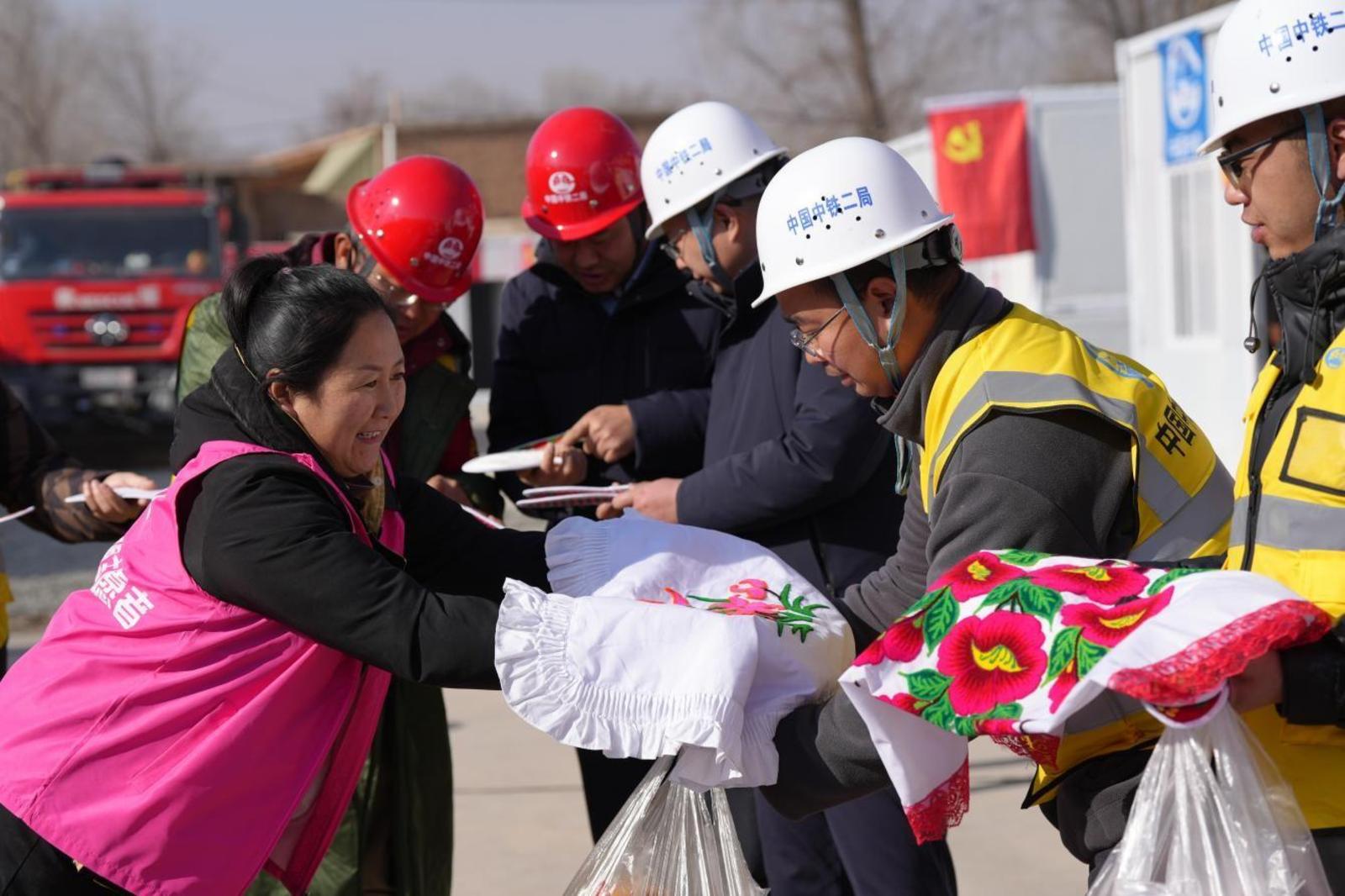 12月24日,青海省海东市民和县中川乡美一村志愿者代表当地群众为安置点建设施工单位送上鞋垫、枕套表达感谢。人民网记者 甘海琼摄