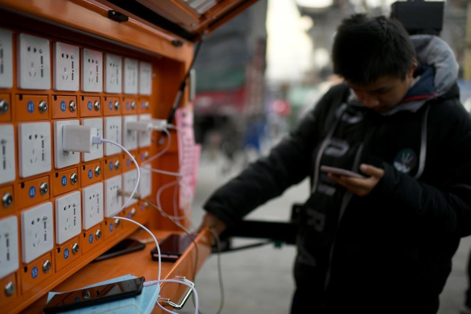 12月20日,在甘肃省临夏州积石山县大河家镇大河村集中安置点,受灾群众正在充电站给手机充电。人民网记者 翁奇羽摄