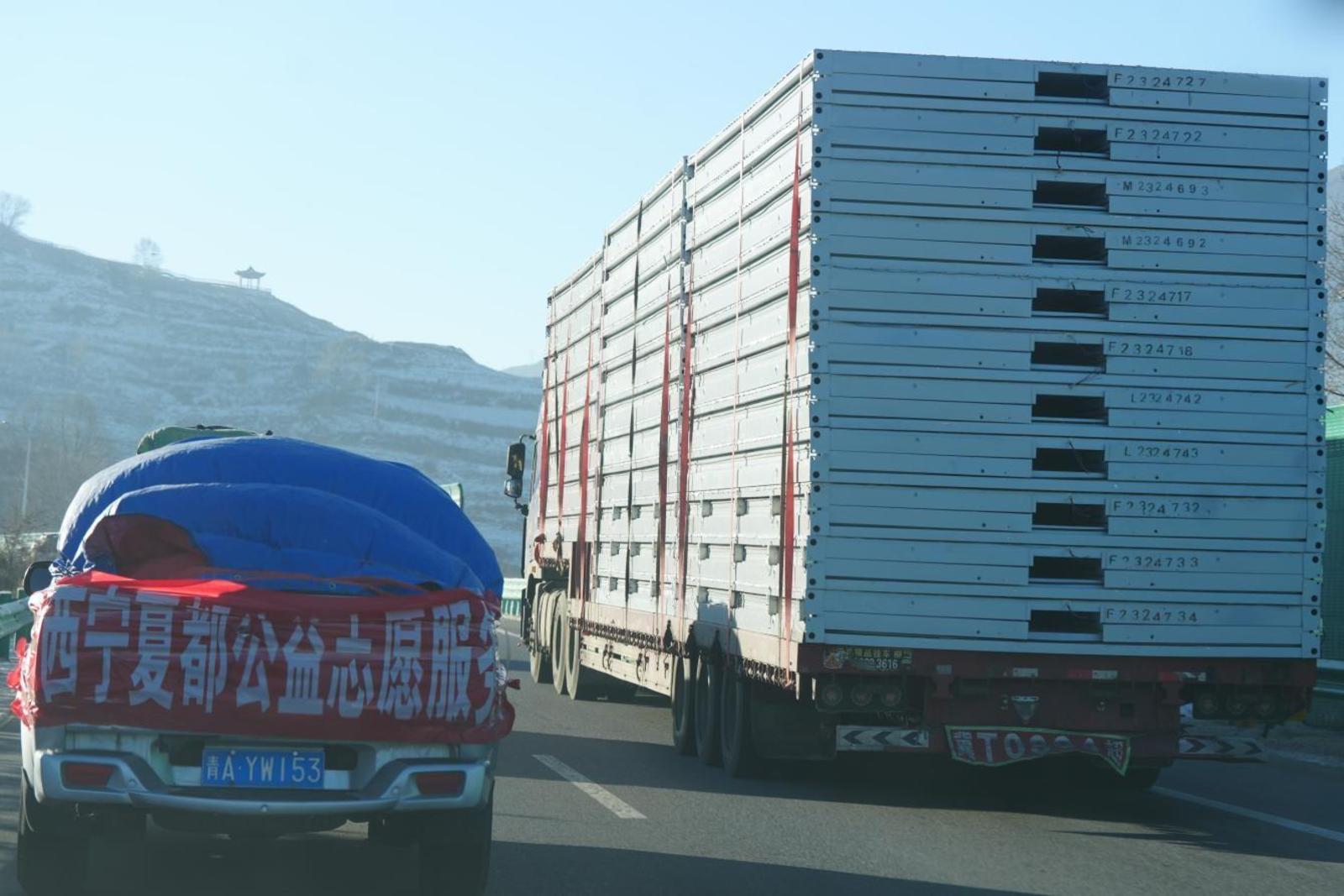 12月24日,行驶在前往青海省海东市民和县的高速公路上的支援物资车。人民网记者 甘海琼摄
