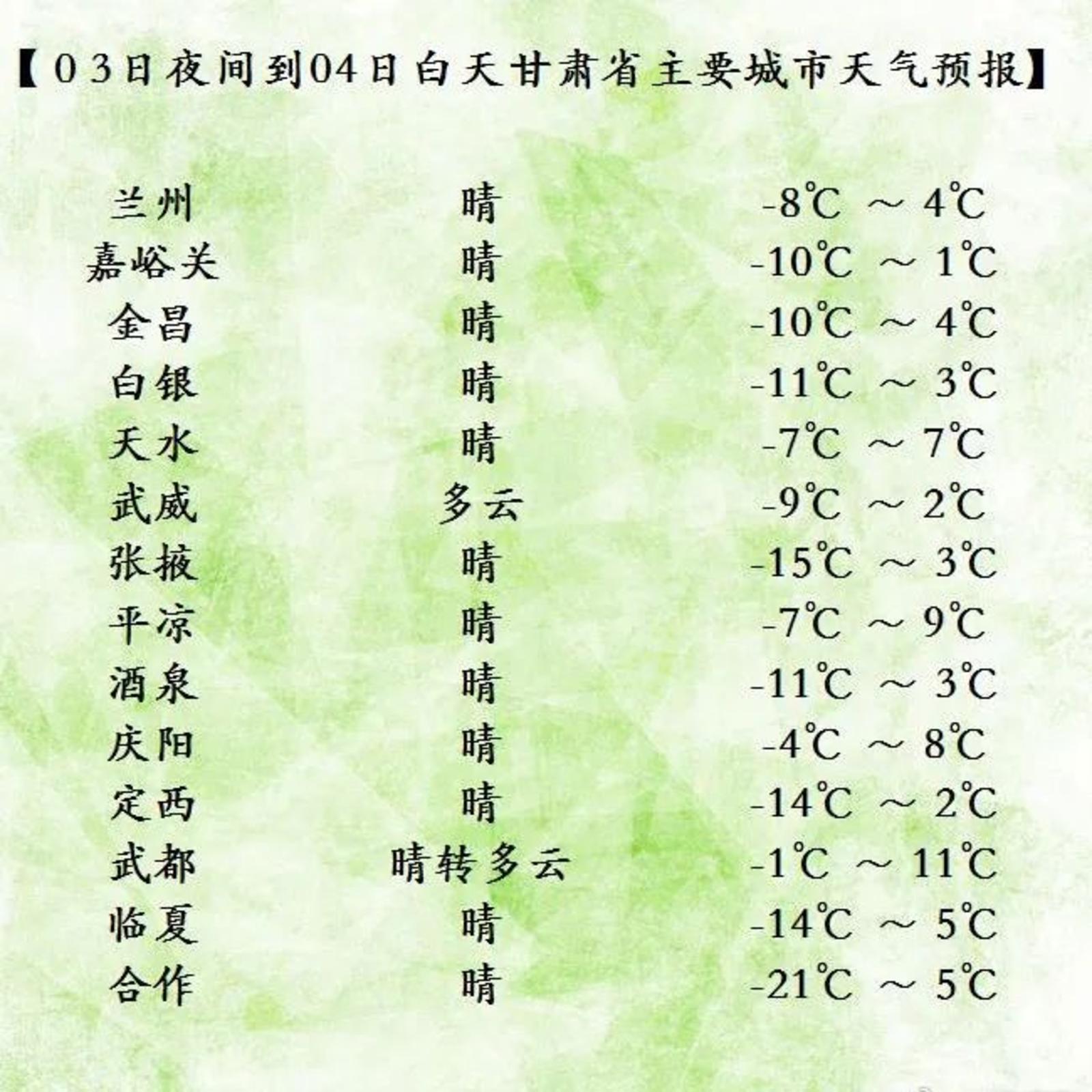 1月3日夜间到4日白天,全省各地多云或晴,另外酒泉、武威两市部分地方及庆阳市北部有4至5级西北风;