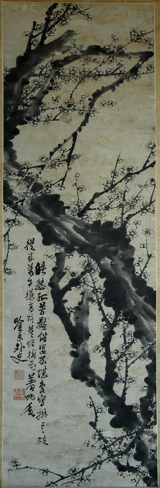 彭玉麟一生所作梅花不下万幅,清水县博物馆馆藏的这幅梅花图属馆内旧藏,其来历已无从考证。这幅立轴梅花图长133厘米,宽42厘米。画面上,一棵下不见根底的老梅,蜿蜒盘旋凌空而上,好似神龙摆尾,显得古拙苍劲,点点梅花用写意笔法一挥而就。画作不着颜色,老干繁枝,遒劲如铁,寒梅点点,暗香浮动,散发着浓厚的文人画气息。