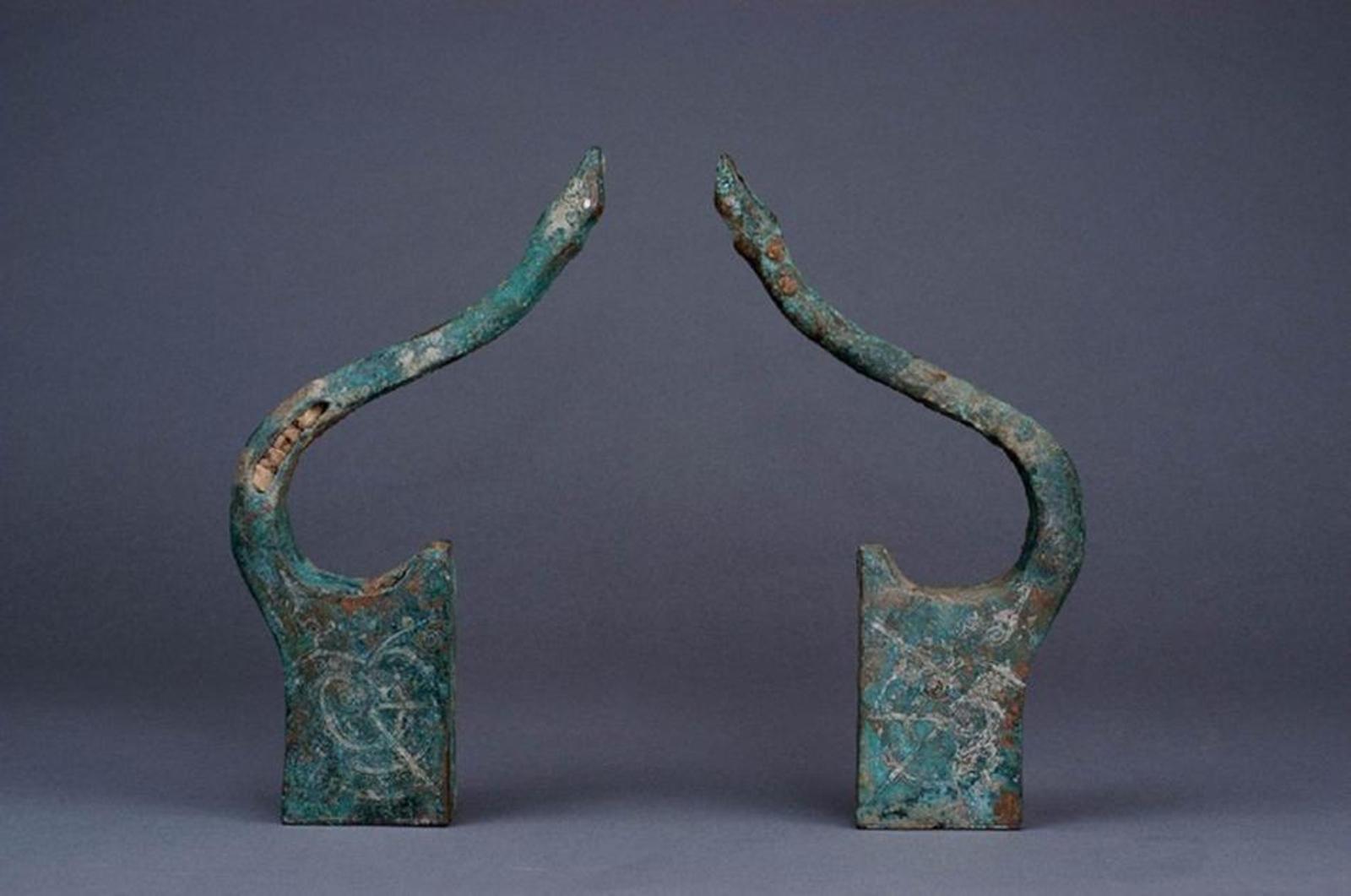 天水市博物馆馆藏一对战国时期青铜承弓器。该承弓器长24.20厘米,宽5.80厘米,厚2.90厘米,一组(两件),大小相同。头部为鸟形,颈细长而弯曲,柄部中空,可插入木楔。柄部一侧有不规则涡纹、曲线纹及弦纹组成的错银云纹图案,鸟头部眼睛亦为铜错银。