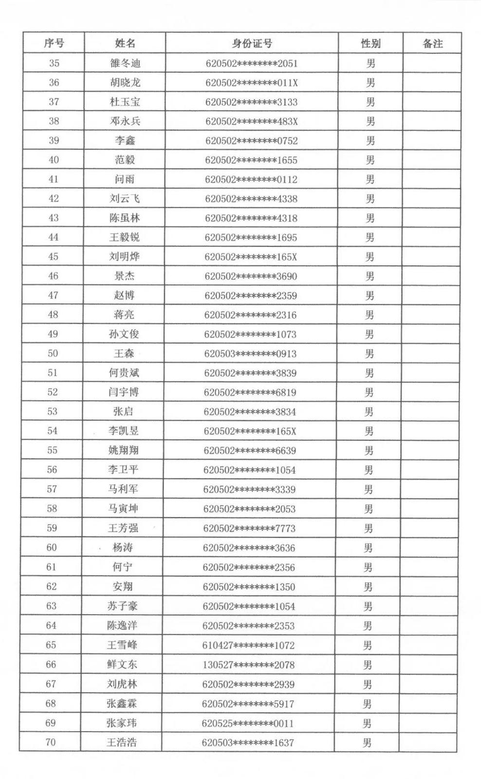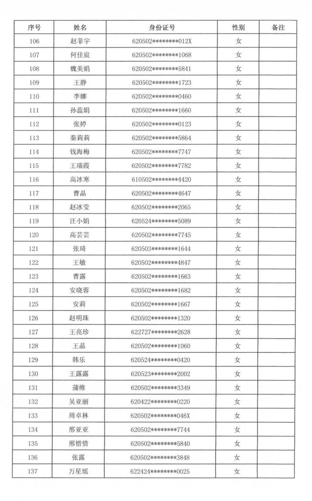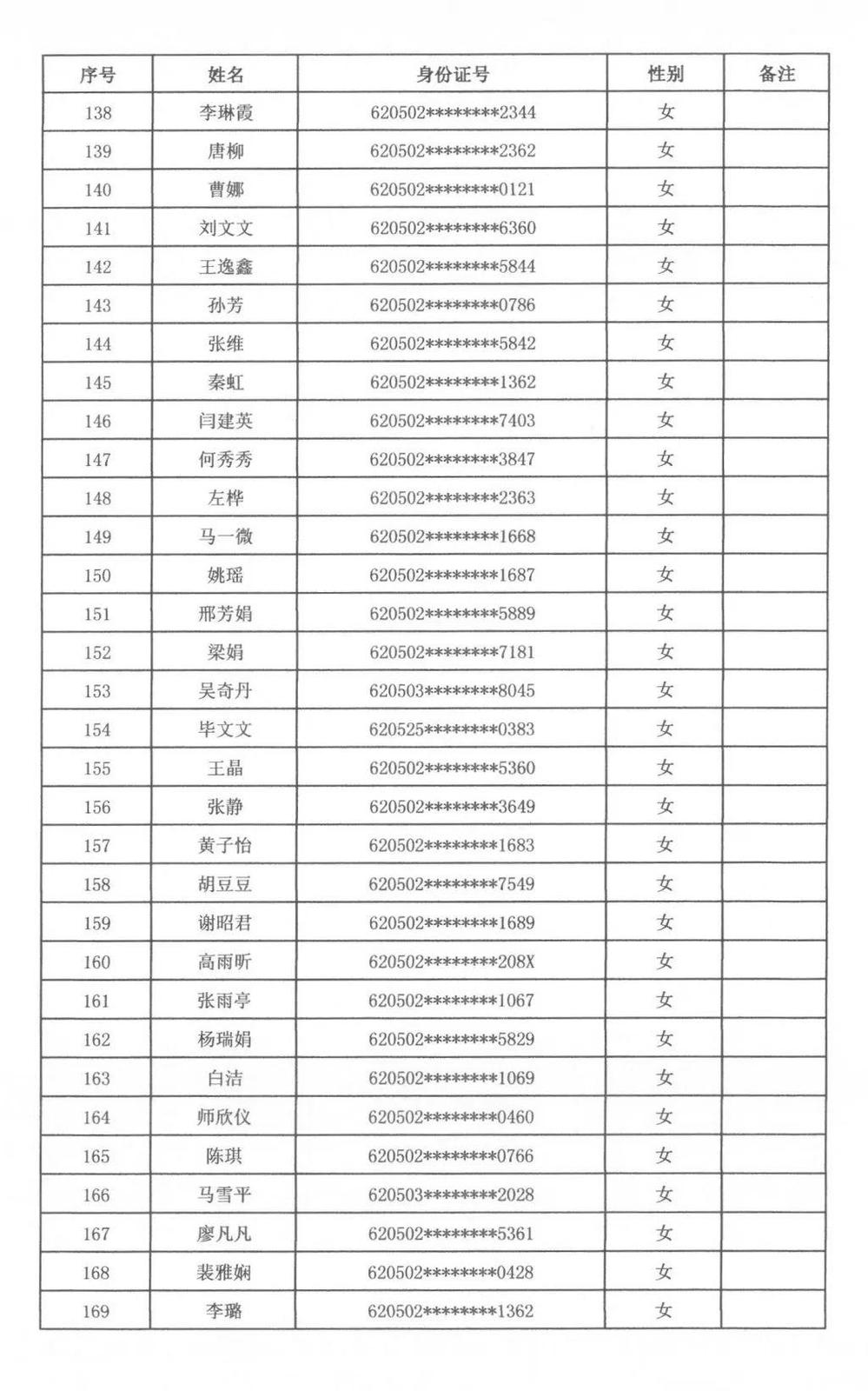 根据天水市秦州区人力资源和社会保障局、天水市公安局秦州分局关于2023年公开招聘警务辅助人员工作安排,通过笔试、面试、体检、政审,拟聘用警务辅助人员男性97名、女性72名,现将拟聘用人员名单公示如下,广泛接受社会各界的监督。公示期满后,将按程序办理聘用派遣手续。