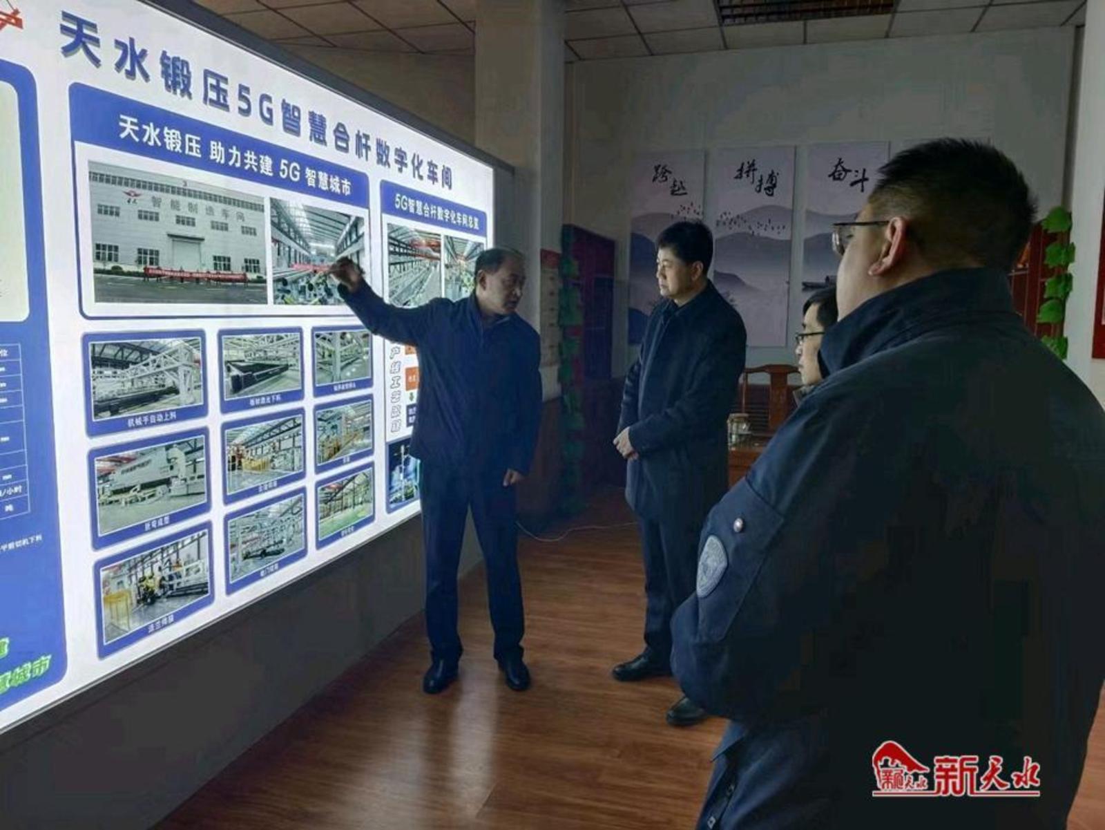 调研组一行在该集团公司办公楼一楼大厅和5G智慧合杆展示厅,详细听取了该集团公司党委书记、董事长陈鸿就制管生产线、5G智慧合杆项目建设、未来发展规划、科技创新思路等的情况汇报。调研组表示,近年来,天水锻压集团抢抓制管行业市场机遇,致力于科技创新,不遗余力推进自身新旧动能转换,加快推动产品结构迈向高端化、智能化发展,为企业实现高质量发展创造了良好条件。