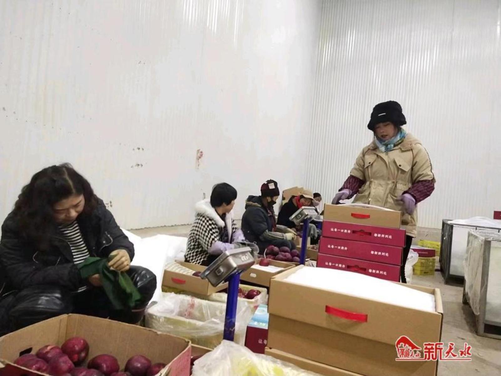 新天水讯 1月17日,在武山县洛门镇五万吨冷链物流园“陇黑钻”苹果装卸区里,工人们正紧锣密鼓地进行苹果分级、包装,旁边停靠的一辆邮政速递货车正等待着当天的货物上车。看着这红火的情景, 人们不禁感叹,直播带货真的开启了果业发展新道路。