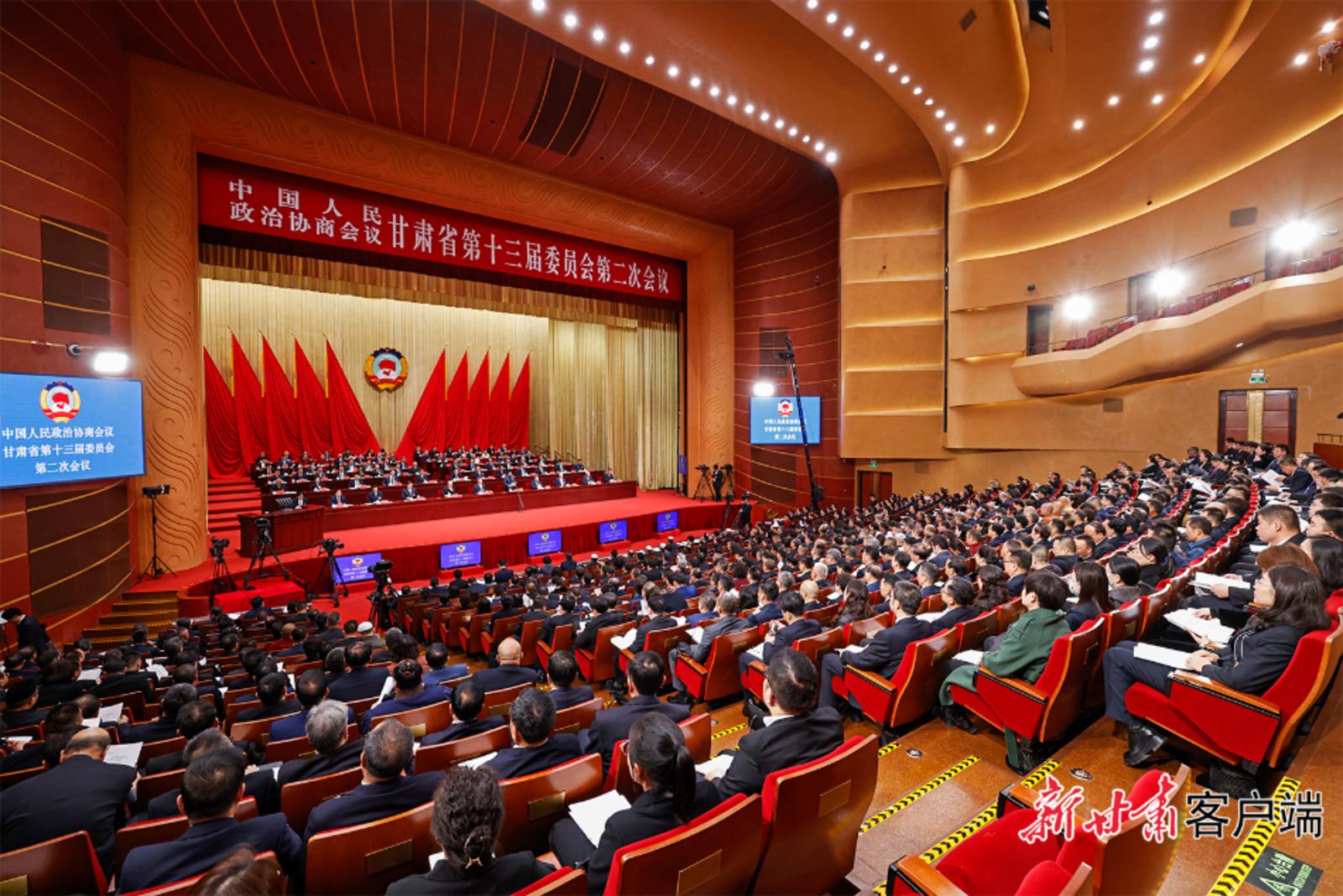 甘肃大剧院内气氛庄重热烈,中国人民政治协商会议会徽悬挂在主席台正中,十面鲜艳的红旗分列两侧。二楼眺台上,“紧密团结在以习近平同志为核心的党中央周围,坚定信心、开拓进取,奋力谱写中国式现代化甘肃实践崭新篇章!”的巨幅标语,鼓舞人心,催人奋进。