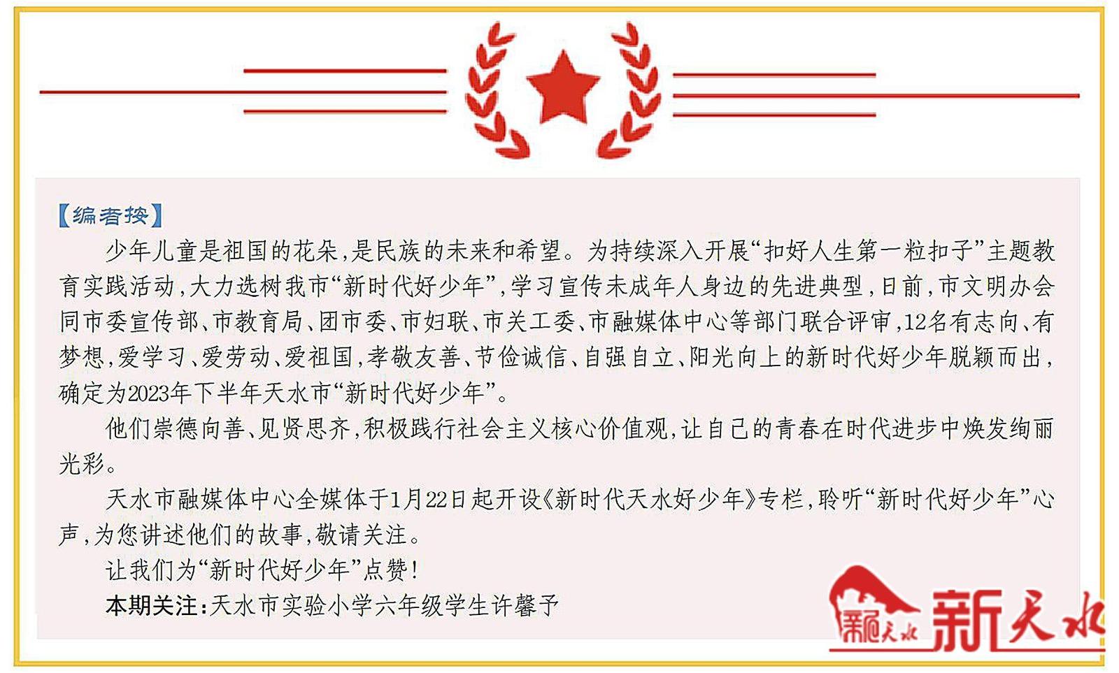 “获得‘新时代天水好少年’这个殊荣,自当更加努力。”许馨予表示,将更加刻苦、努力,铭记大家的鼓励和鞭策,以爱心、恒心、信心托起自己的梦想,争当热爱祖国、理想远大的好少年,将来为全面建设社会主义现代化国家贡献智慧和力量。