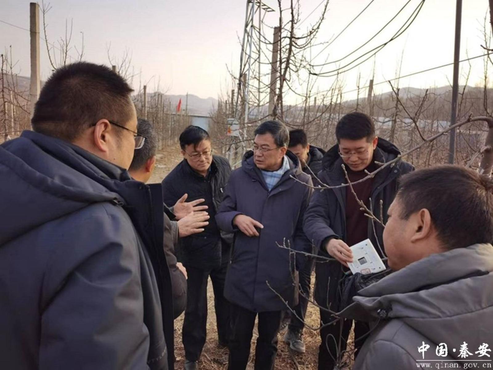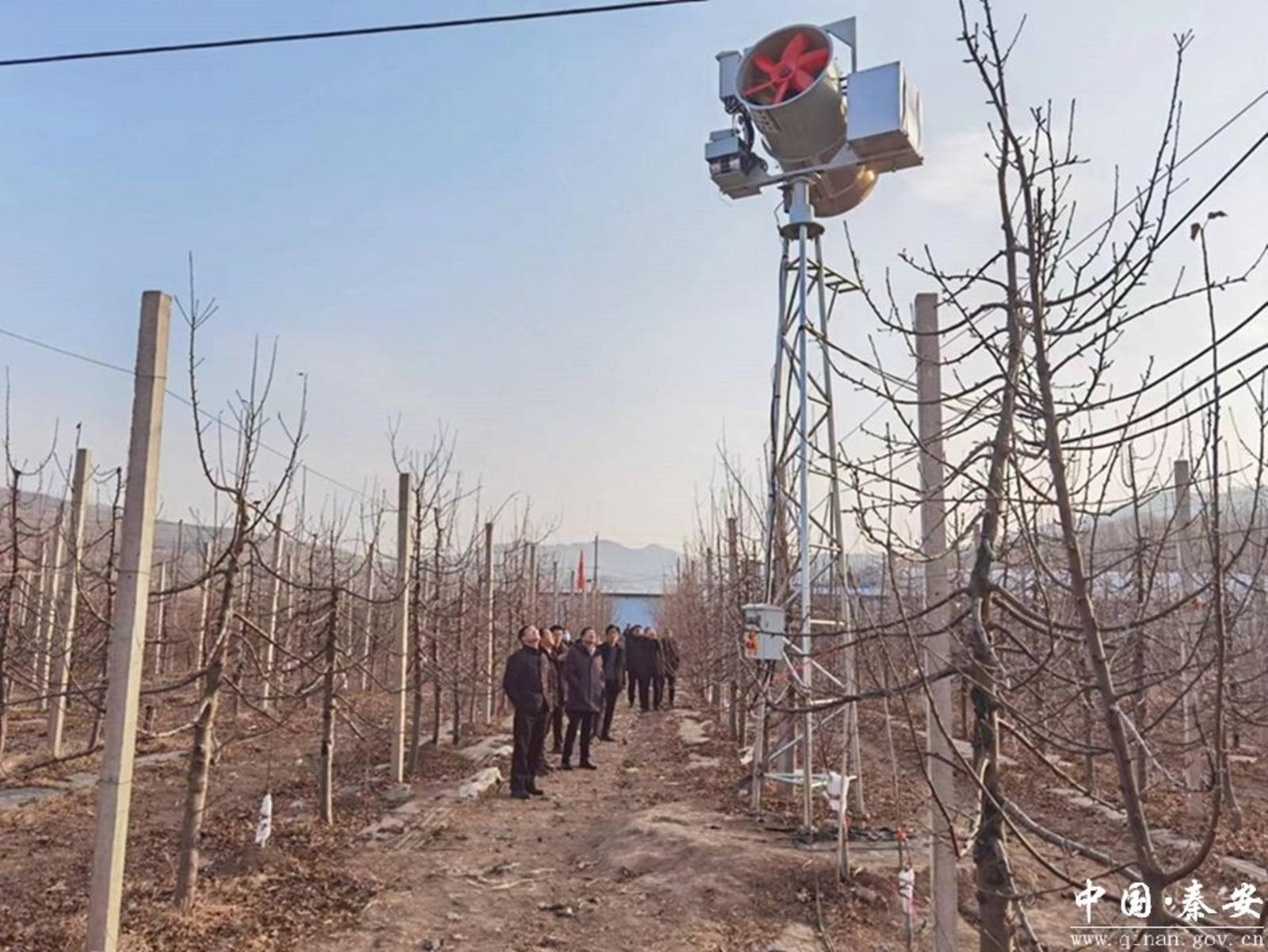 会前,参会人员先后来到秦安县魏店镇陈庄村和五营镇薛李村,考察观摩了果园多防网(棚)建设试验示范点、秦安新润农业科技有限公司暖风式防霜机的安装应用情况,与会专家对两种防霜冻模式进行了现场点评,指导讲解了果园霜冻预防技术。