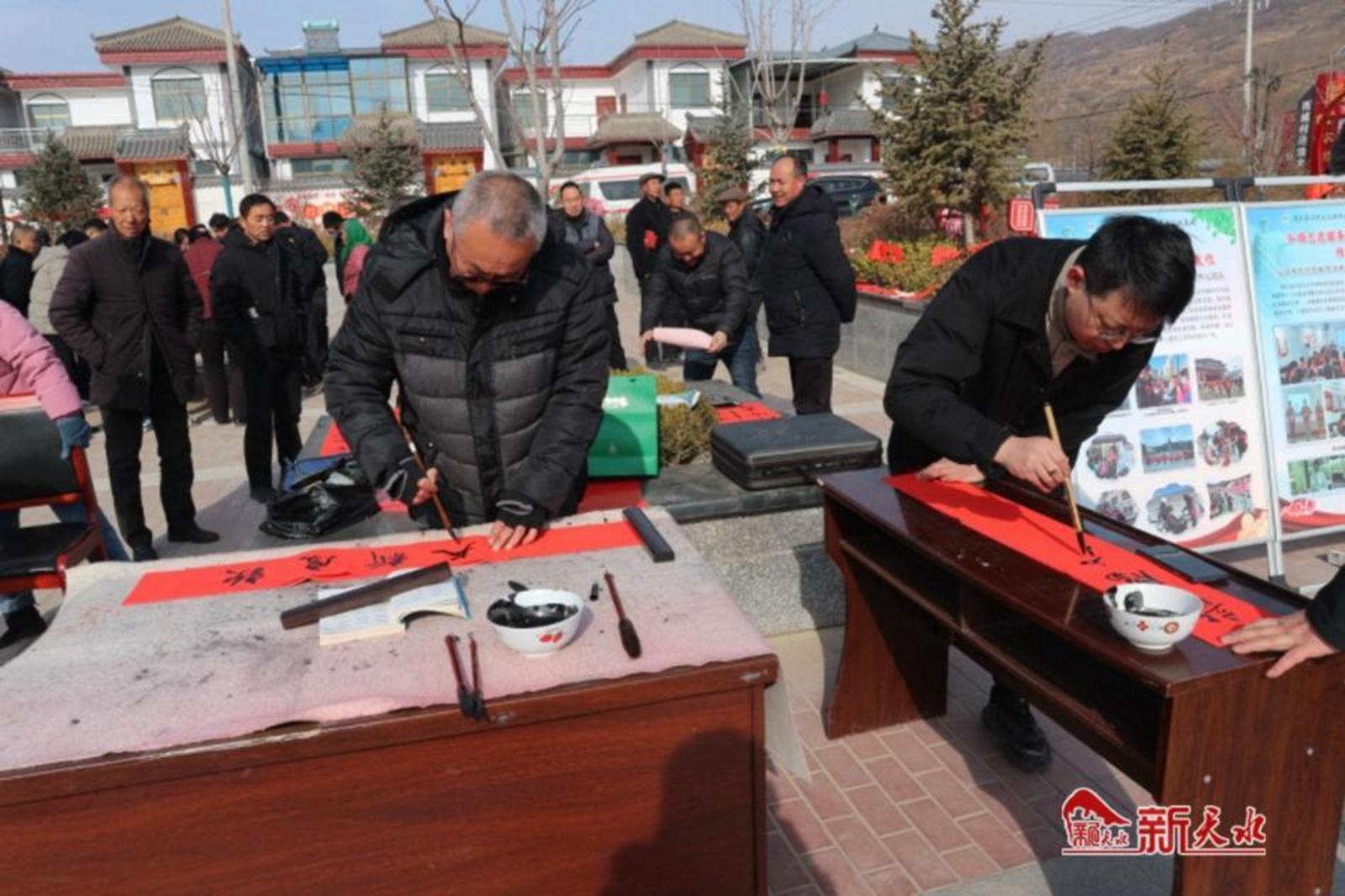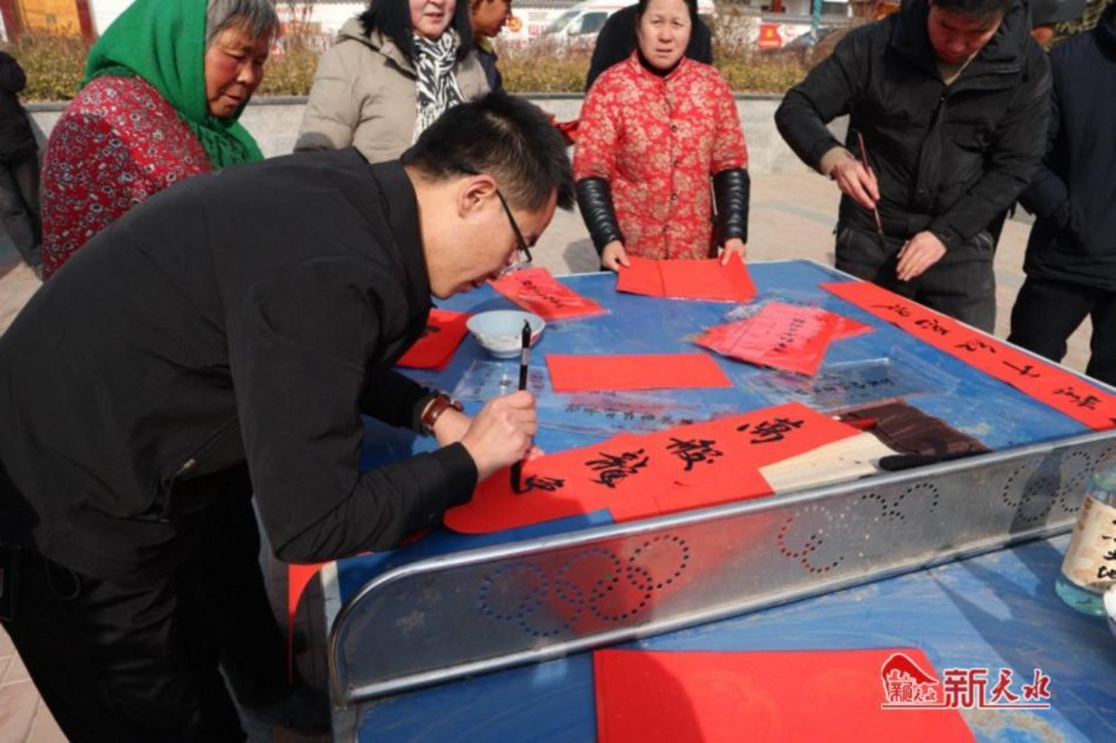 在活动现场,书法老师们铺开红纸挥毫泼墨,以精美的笔法书写吉祥喜庆的春联,向乡亲们赠送祝福。一副副饱含着美好祝愿的春联被大家争相领取,现场洋溢着欢乐喜庆的氛围。