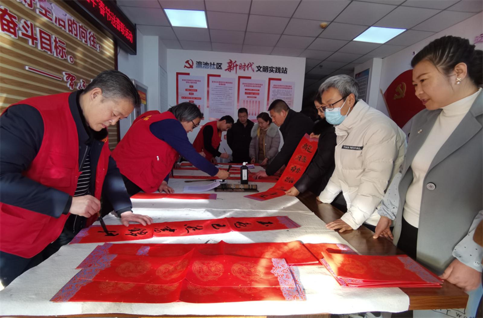 “去岁莲亭赏玉兔,新年瀛池腾金龙。”天水郡街道瀛池社区和莲亭社区虽为两个社区,却只一墙之隔。1月30日下午,在两个社区新时代文明实践站,挤满了闻讯赶来的辖区群众。会议桌上,毛毡、墨汁、对联纸等摆放整齐。随着身着红马夹的文艺志愿者的挥毫泼墨,“龙腾丝路三千里,燕唱陇原十万春”“宜居社区和为贵,幸福家庭德有邻”“平安社区春来早,和谐家庭喜事多”......不一会儿,一副副散发着清新墨香的春联和福字就呈现在大家眼前,浓浓的年味荡漾在群众心头