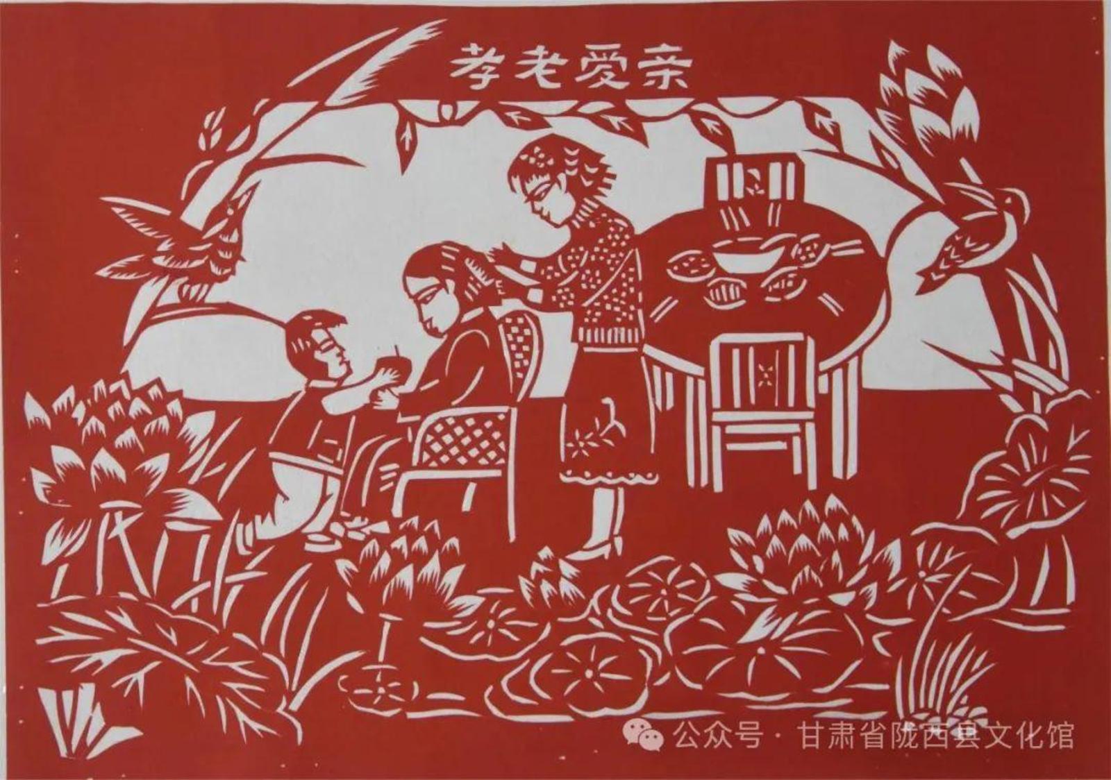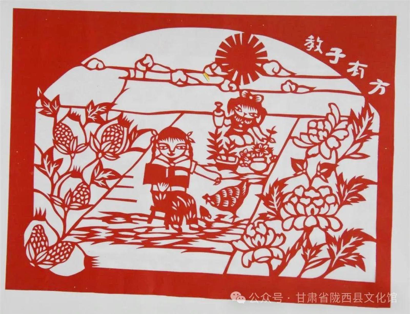 陇西剪纸是陇中剪纸的重要组成部分,剪纸群体也是陇中剪纸的重要力量。而且有大量的传统剪纸样式留存在民间艺人手中,通过家族传递,师徒传承,形成了具有鲜明地域剪纸样式的艺术特色。特别是陇西“一架山”剪纸是全国唯一,其艺术语境十分独特。乔晓光教授在《村社传统田野手记》一书中写道:“在陇西还发现了窗花张贴的格式‘一架山’。这是一种非常独特的窗花组合,其中把花草、动物、娃娃有序地组合在一个三角形格式中,窗格中每个单幅剪纸使用技艺丰富,有彩色的、立体的,还有编织的。我们拜访的‘一架山’窗花传承人是一位70多岁的男性传承人,他是一位学习女红手艺的天才,少年时开始和二嫂学剪纸、刺绣,技艺样样精湛;他还是一个唱曲的艺人,说唱、表演都很精通。”乔晓光教授通过十多年的民间采访采风,完成了沉甸甸的八本《村寨里的纸文明》专著,对全国无数村社32个民族的剪纸进行了深度考察和研究。因此,他对陇西剪纸的如是论述,不论是剪纸特色、传承人以及其价值意义,还是陇西剪纸在全国的影响力,都是最准确最权威的注脚,无需再赘述。——这就是陇西剪纸。