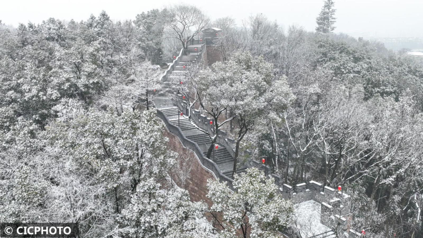 ↑2024年2月6日在浙江省湖州市德清县乾元镇拍摄的雪后古城墙。(无人机照片)CICPHOTO/王树成 摄
