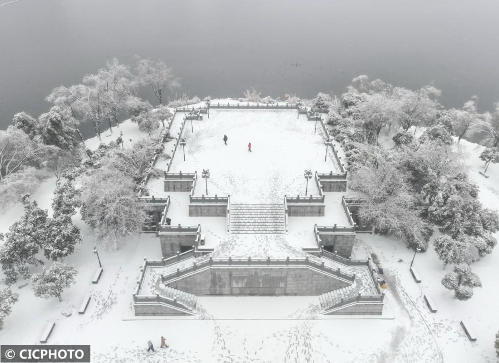↑2024年2月4日,游人在湖北省武汉市沙湖公园赏雪游玩。(无人机照片)CICPHOTO/赵军 摄