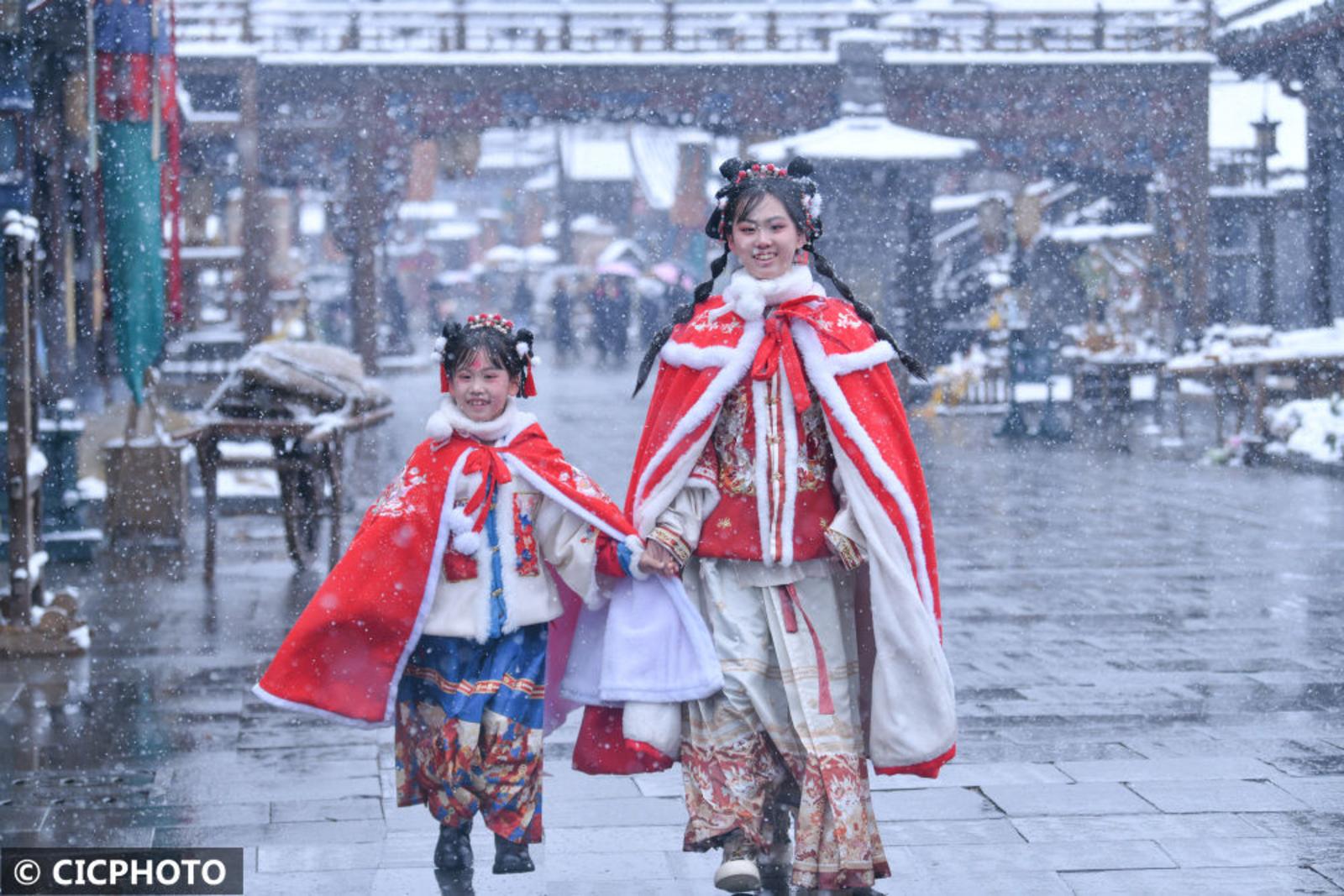 ↑2024年1月22日,游人在浙江省东阳市横店影视城清明上河图景区赏雪游玩。CICPHOTO/吴意琼 摄